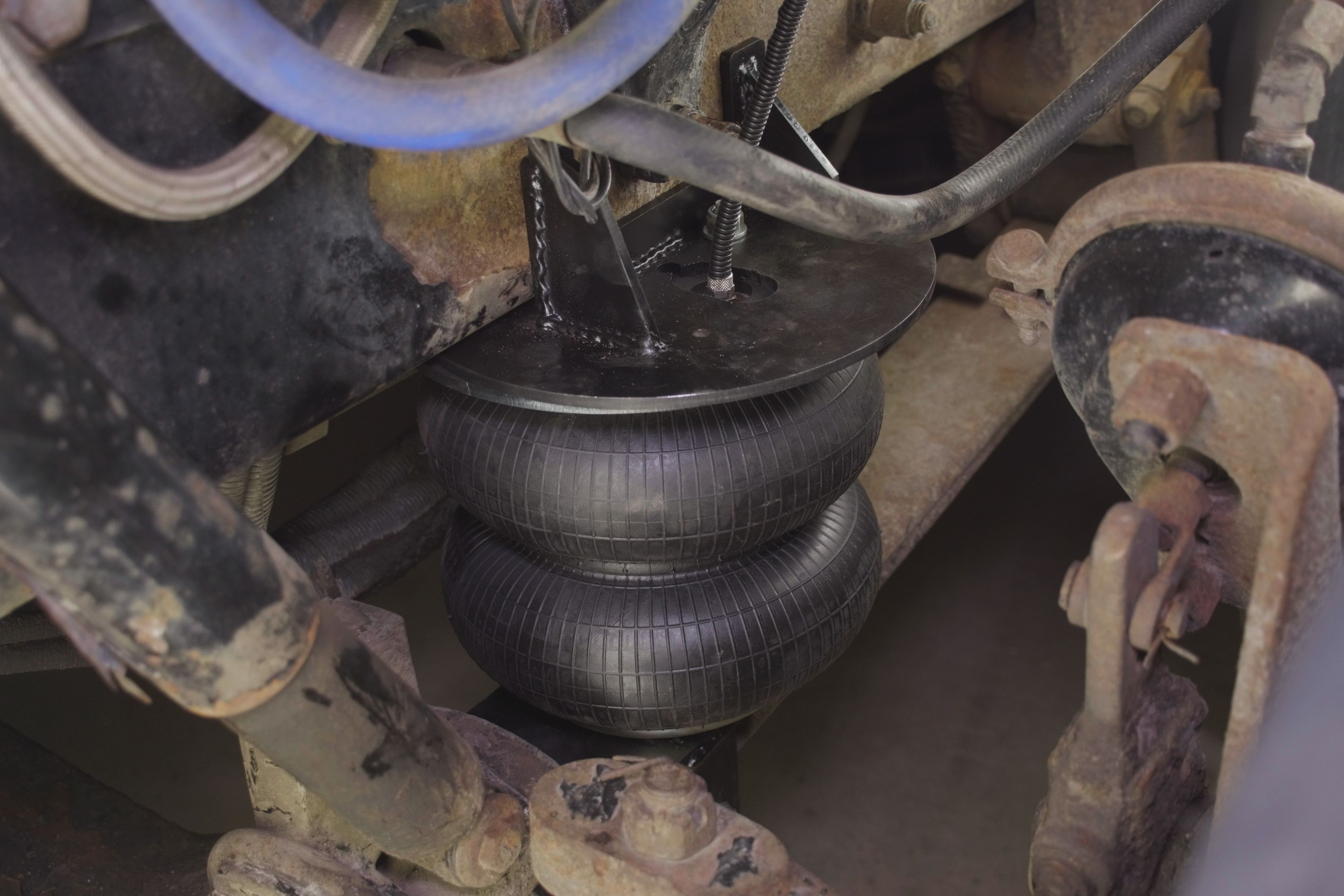 На переднюю ось были установлены пневмоэлементы 250/2, каждый из них способен поднять до 2000кг при давлении в 8 атмосфер. Верхний кронштейн надёжно крепится к раме, а нижний кронштейн надевается на пакет рессор, надёжно обхватывает его и притягивается болтовым соединением. Так же для того что бы полностью исключить смещение нижнего кронштейна, они был надёжно зафиксирован при помощи обхватов за стремянные болты.