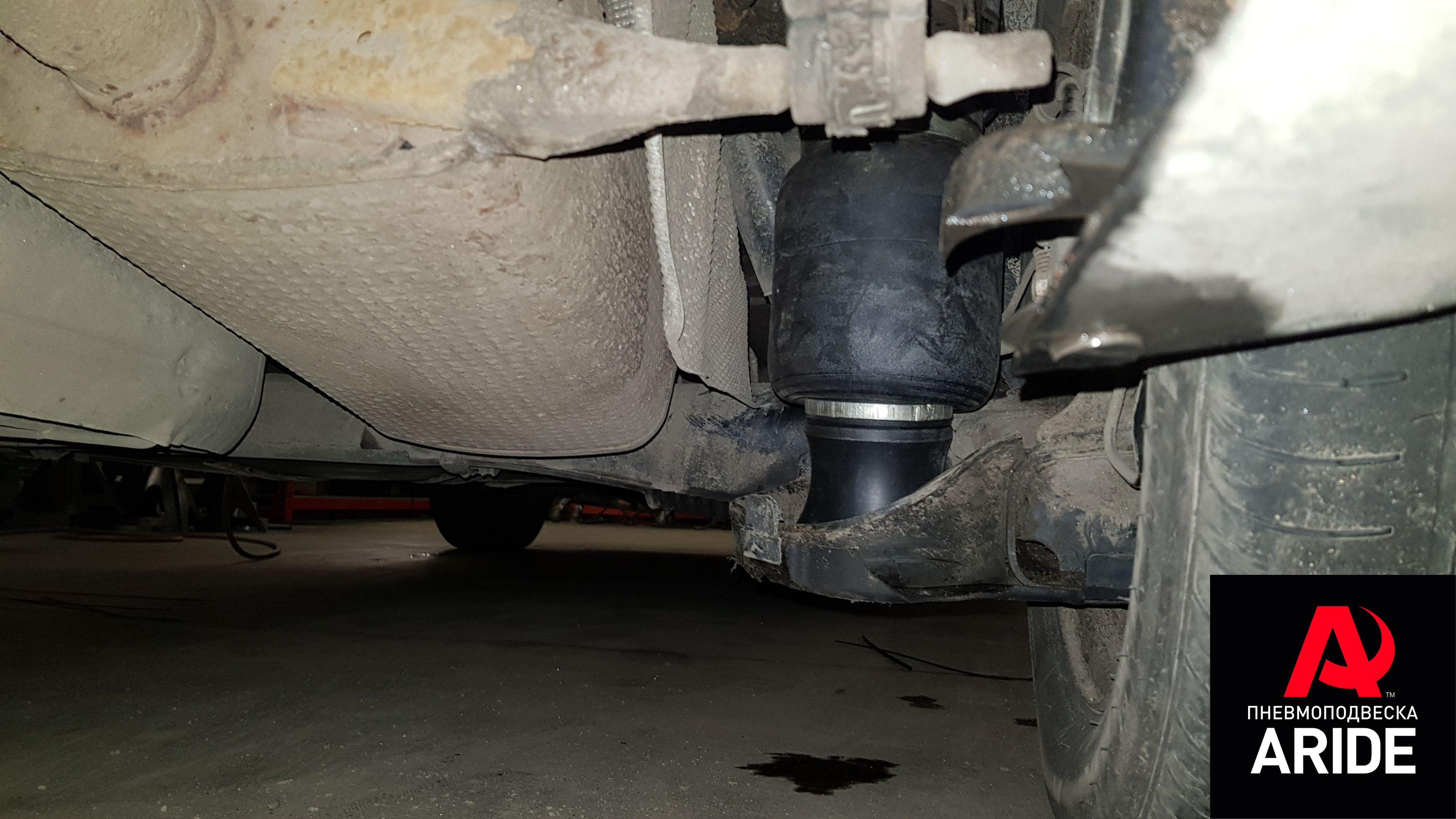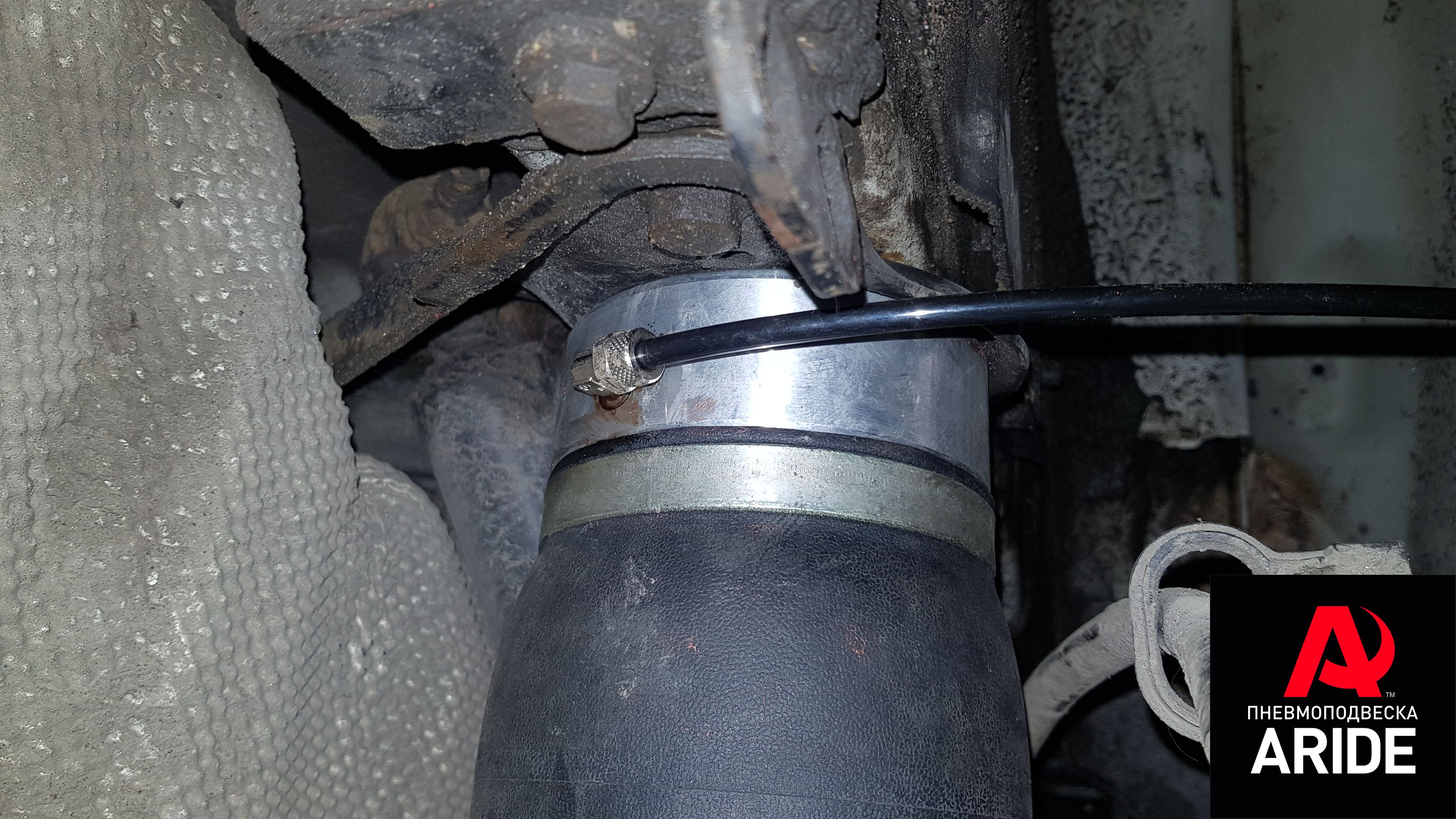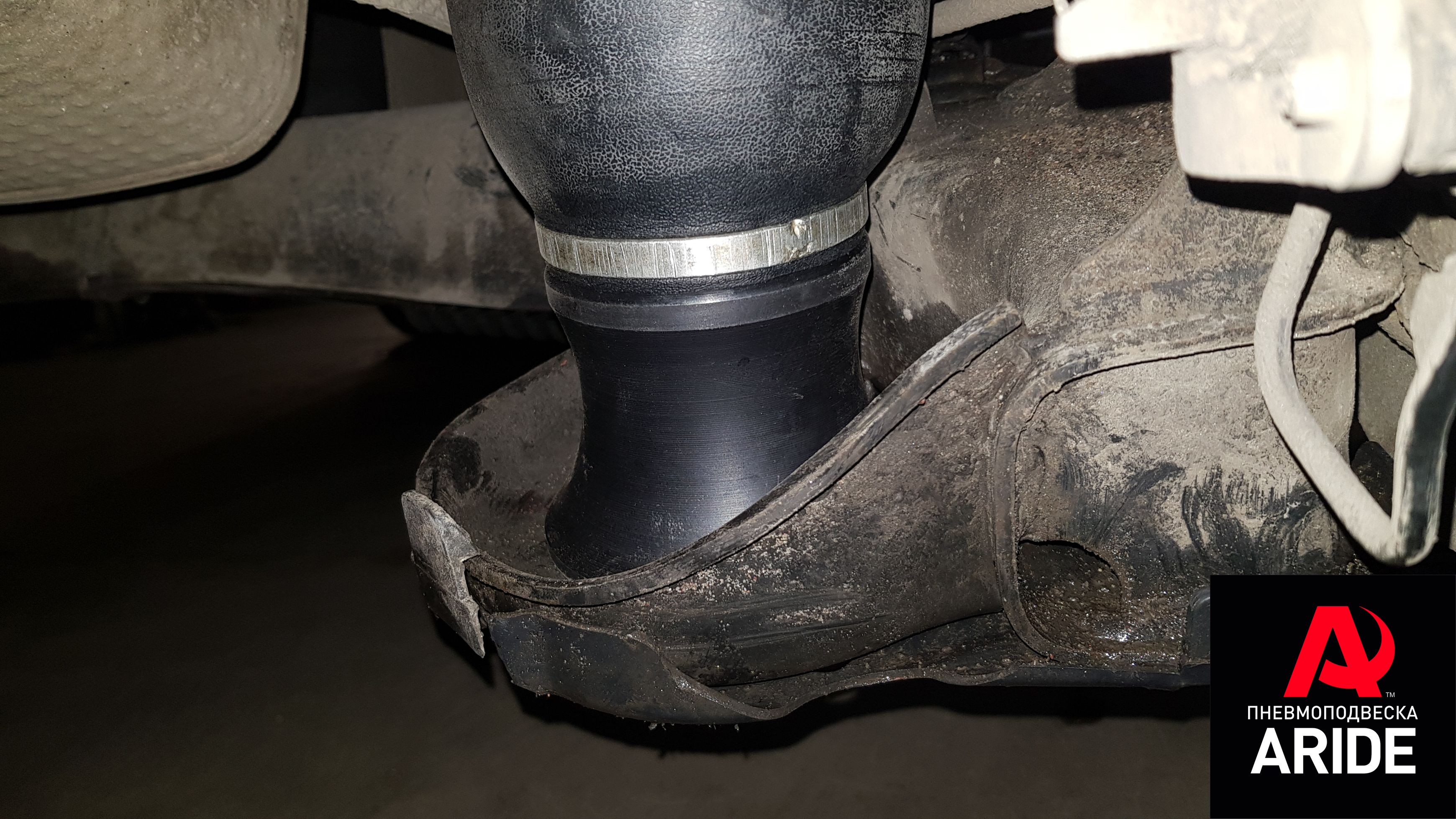 Монтаж достаточно прост, нужно демонтировать заводские пружины, далее установить верхний фланец пневмоэлемента на штатное место для крепления пружины, и остаётся завести нижний фланец подушки на балку и притянуть при помощи болтового соединения.