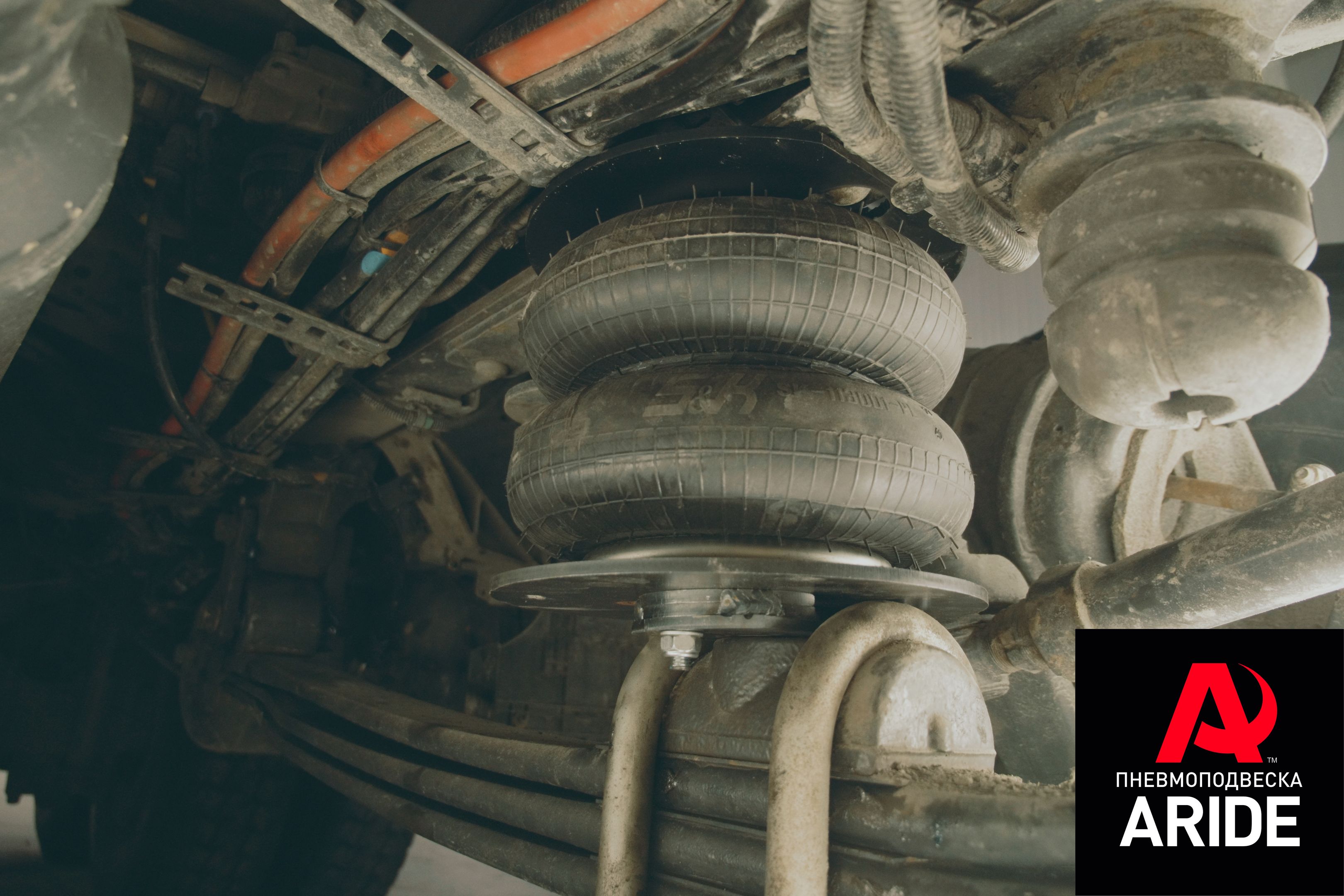 Перед началом установки, заказчик поменял все четыре пакета рессор на передних осях. Далее по готовым размерам, нашими специалистами был разработан и смонтирован комплект вспомогательной пневмоподвески. Конструкция получилось достаточно надёжная и имеет большой запас прочности. Все четыре верхних кронштейна надёжно крепятся к массивной раме. Нижние же кронштейны так же надёжно закреплены к штатной проставке-креплению амортизатора. А она в свою очередь обхватывается стремянными болтами и надёжно крепится к пакету рессор. Такой установкой кронштейнов нам удалось достичь максимального КПД пневмпоэлементов. Так как нижняя часть подушки упирается в балку, мы смогли равномерно разгрузить листы рессор. Создать дополнительную точку опоры. При давлении в 8 атмосфер, каждая подушка способна компенсировать до 2000кг.