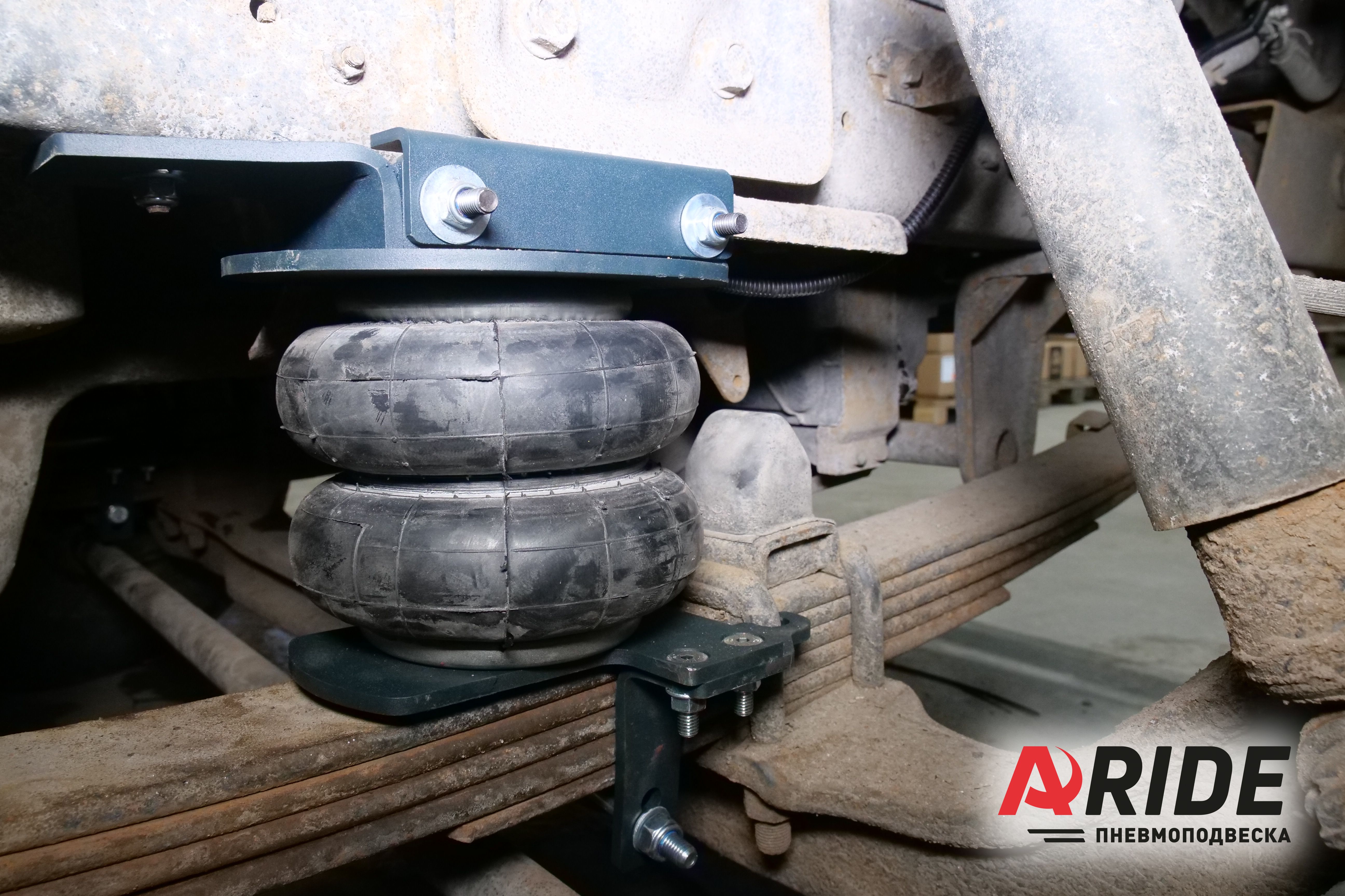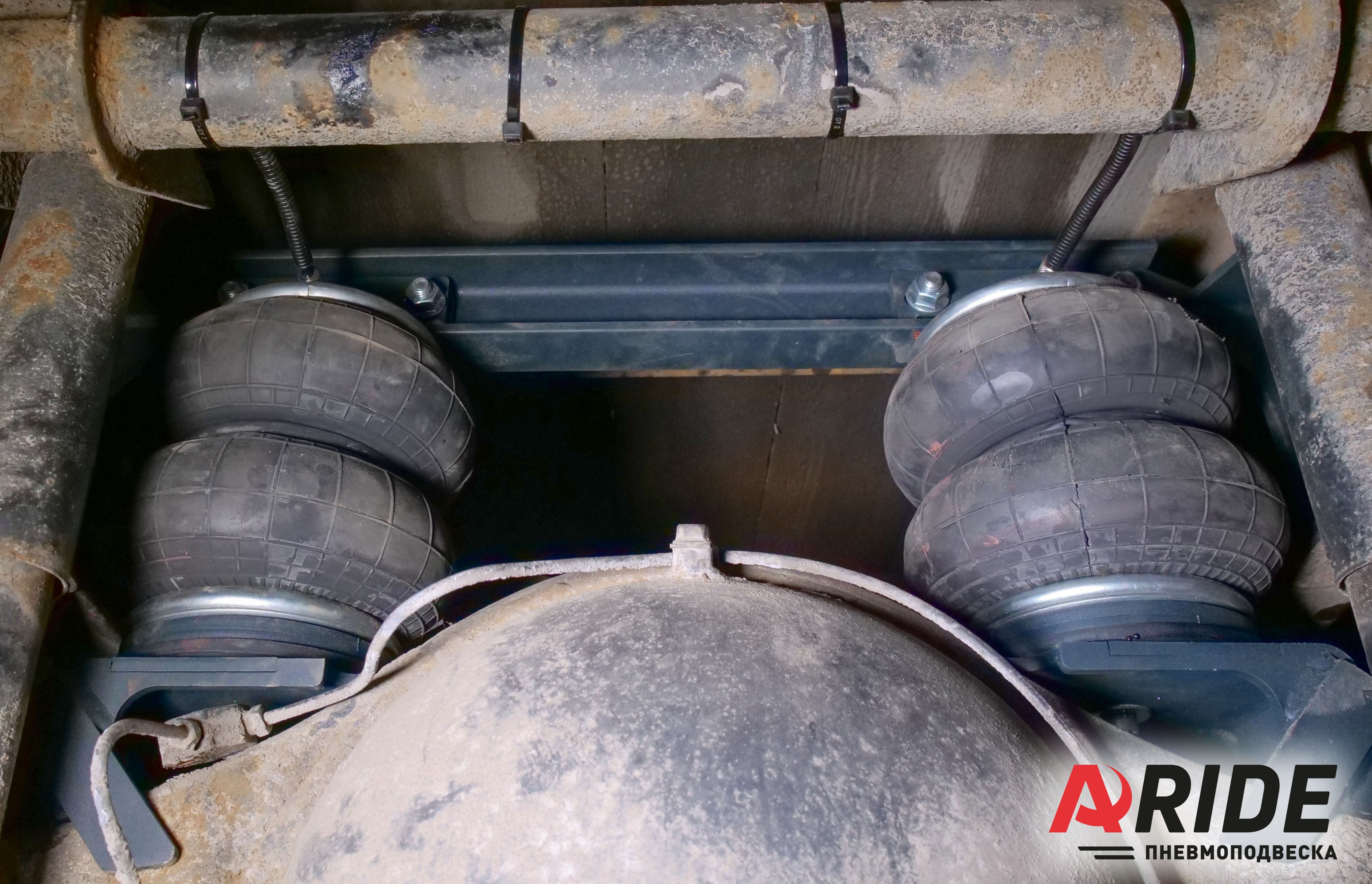 Передний комплект оснащён подушками 160D1, каждая способна компенсировать до 1100 килограмм. Передний же комплект устанавливается между рамой и пакетом рессор. Кронштейны крепятся к раме, и пакету рессор. При такой компоновке удалось сохранить заводские отбойники.