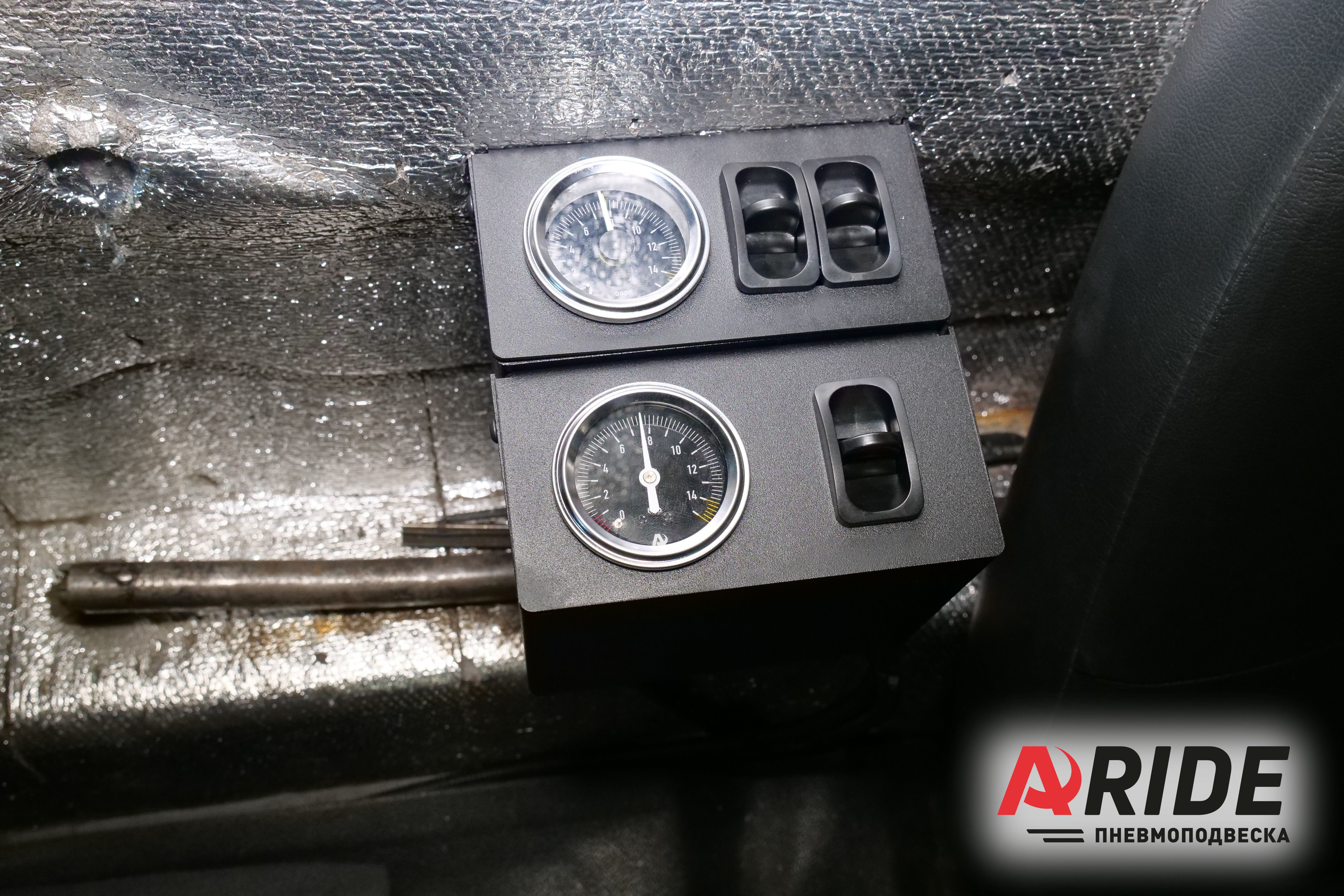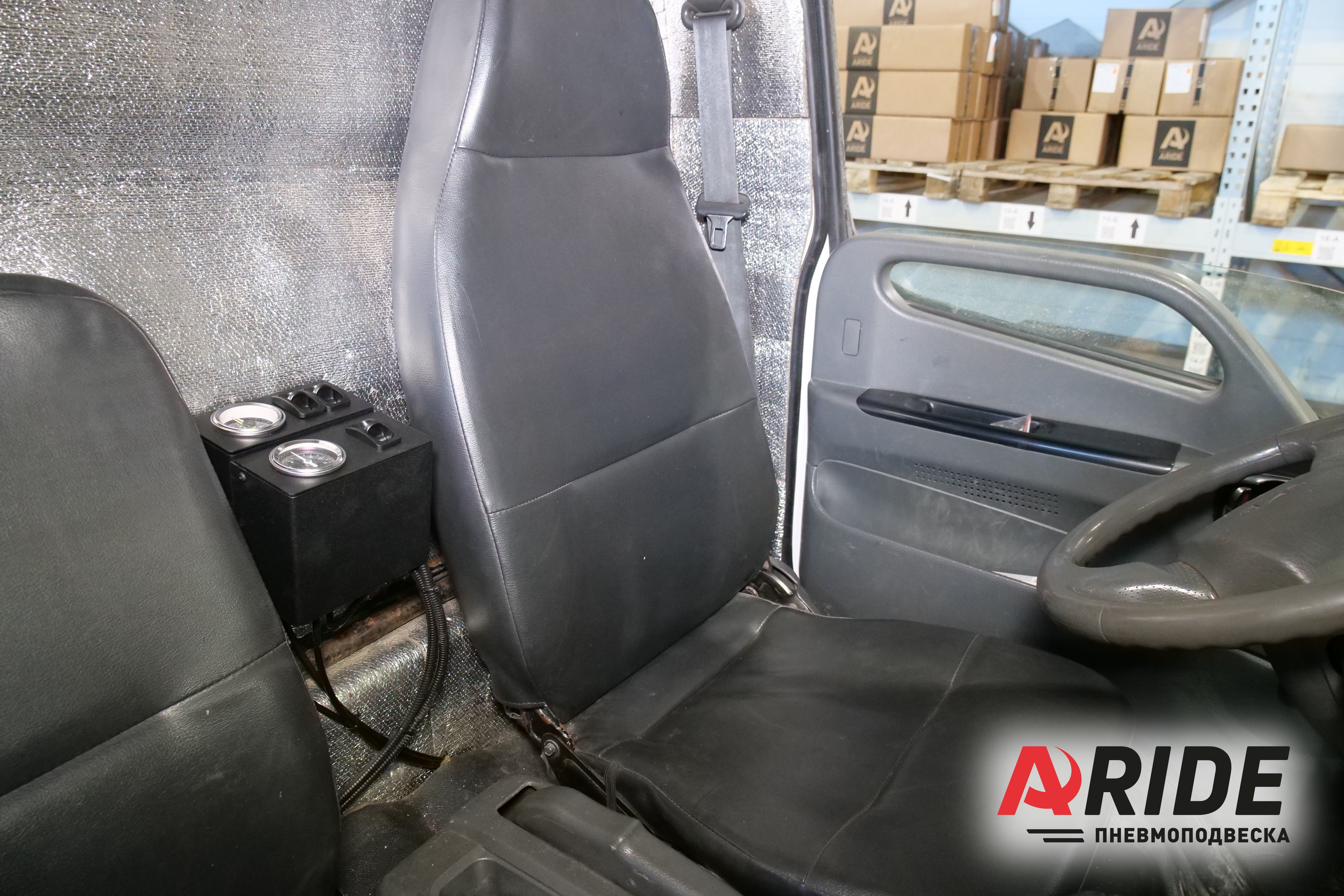 В качестве системы управления была выбрана трёхконтурная система 3.Оптимал. Данная система способна отдельно регулировать давления в трёх контурах, двух контурах на задней оси, и одном контуре на передней оси. Манометры и пневматические клавиши устанавливаются между водительским и пассажирским сидениями. Компрессор идеально крепится через специальную пластину, за задней спинкой пассажирского сидения.