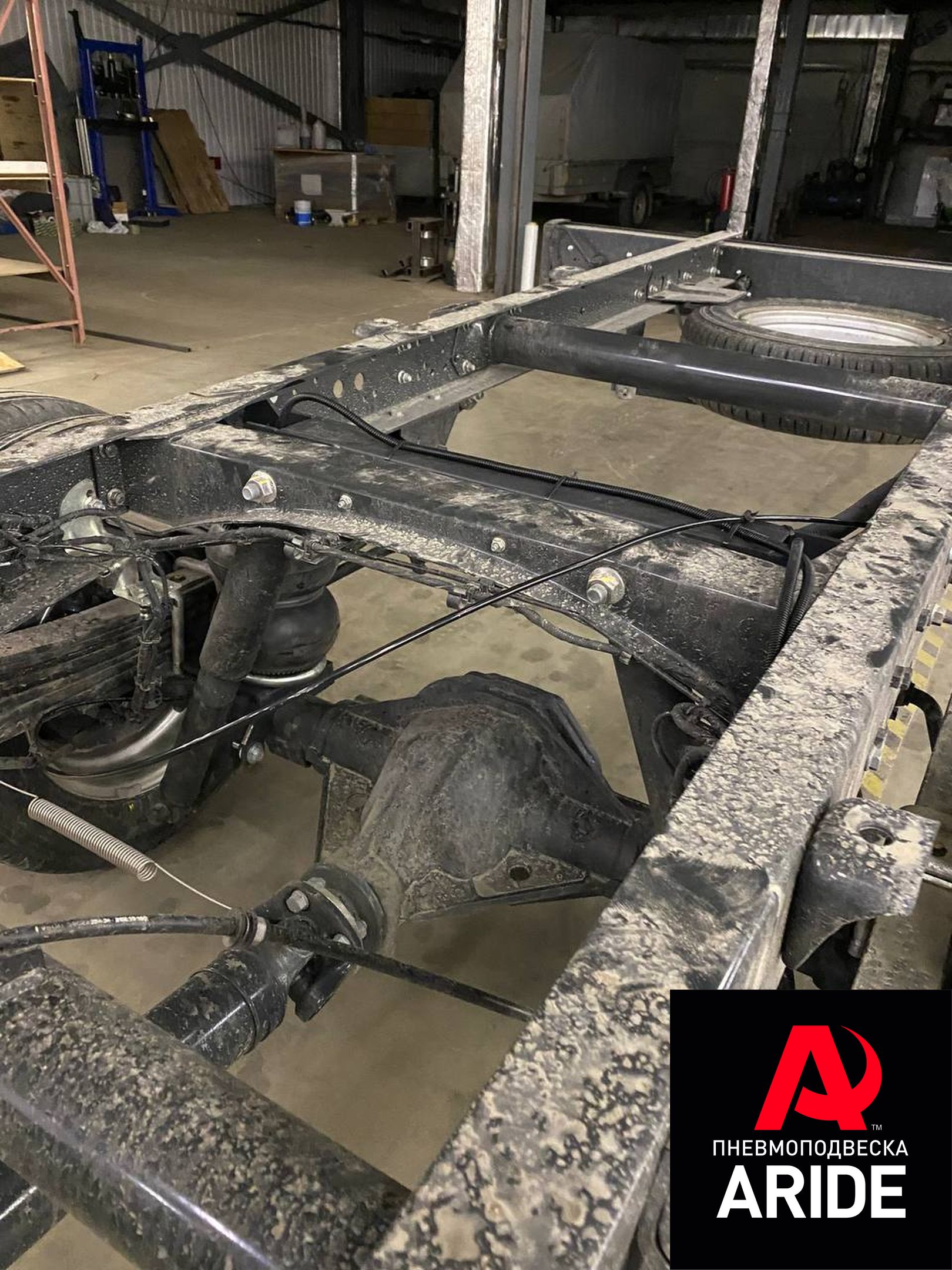 В итоге на заднюю ось был установлен усиленный комплект вспомогательной пневмоподвески. Подушки 180D1, поперечный усилитель, кронштейны из 6 мм стали, всё это дало нам 3000кг компенсации нагрузки с задней оси.
