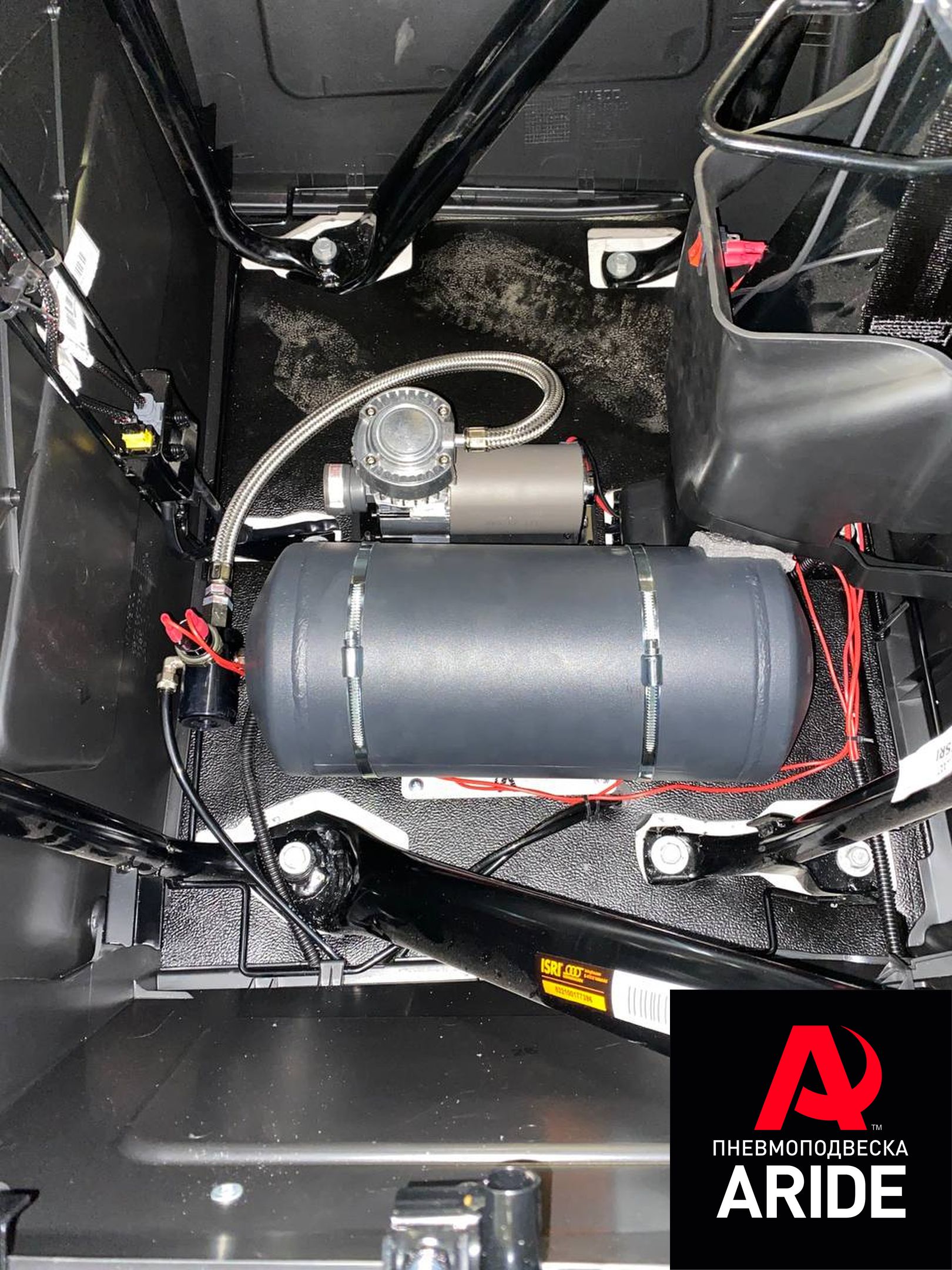 А для управления подушками на задней оси, была выбрана двухконтурная система управления на 5 литровом ресивере и компрессоре Berkut PRO 17. Для отслеживания и регулировки давления, был установлен двухконтурный манометр с подсветкой (от зажигания), и две пневмоклавиши. Манометр и клавиши расположили достаточно удобном месте, между водительским сидением и пассажирским, сбоку от ручника.