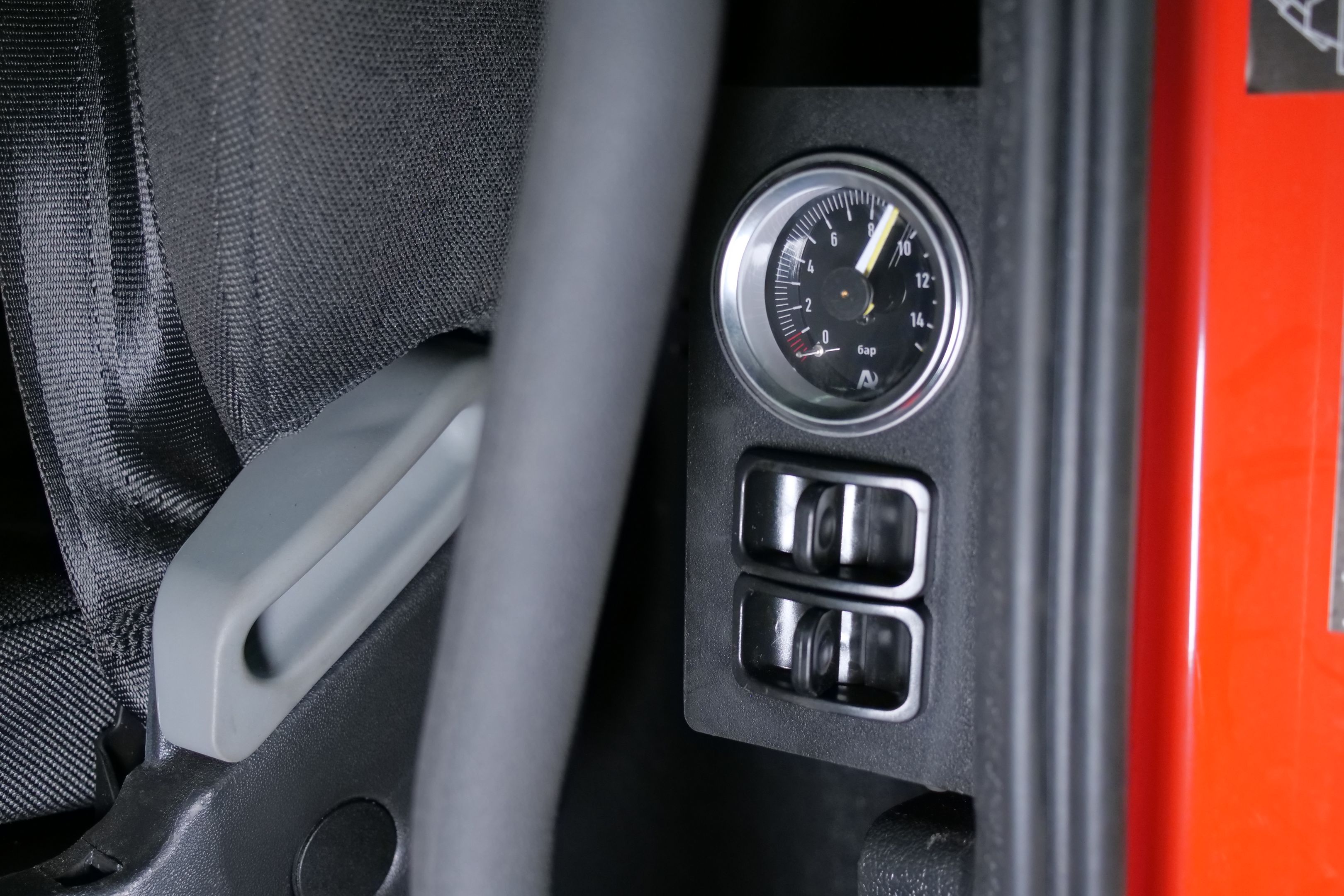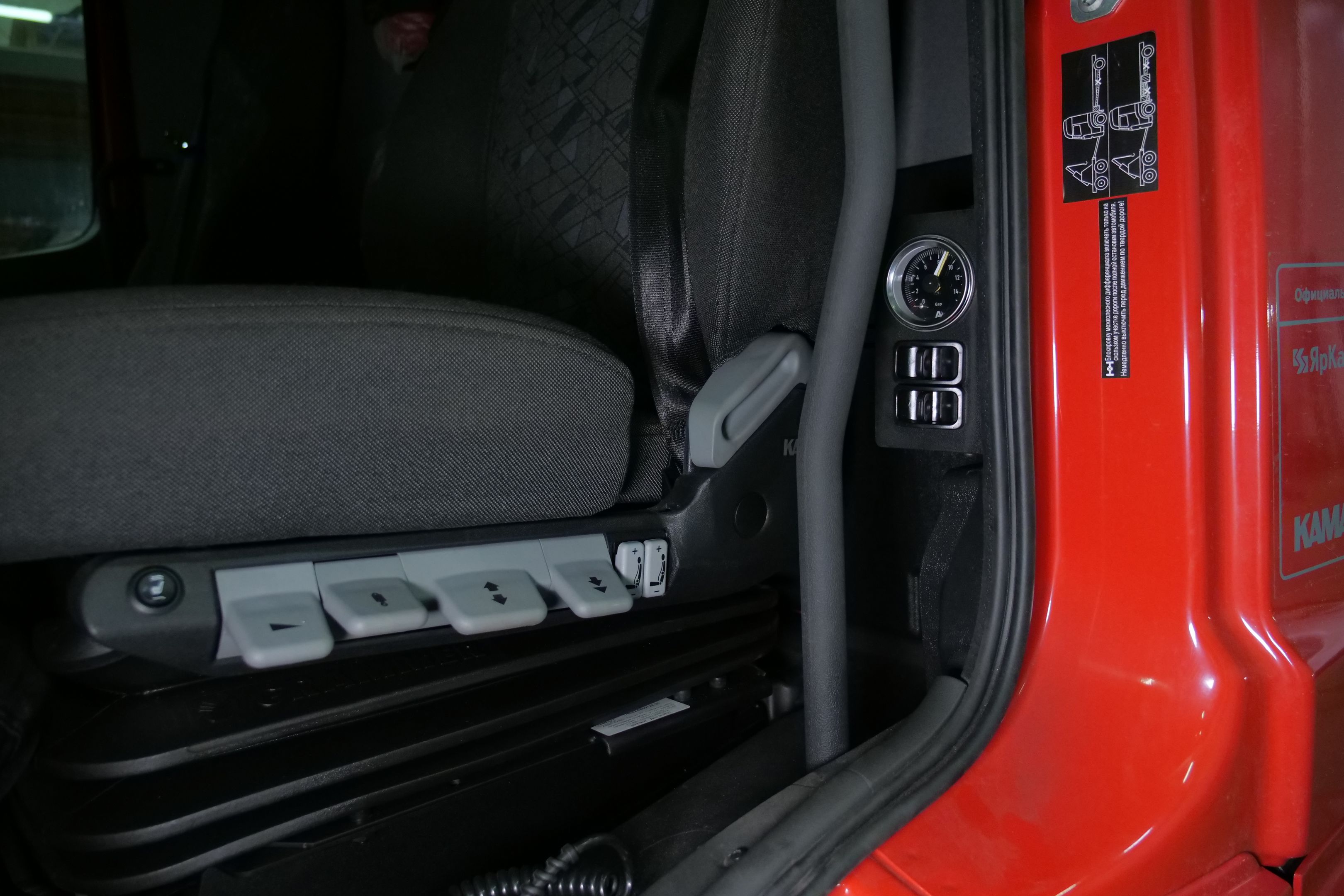 Воздух для управления был взять от заводского ресивера. Чтобы избежать какой либо утечки, после заводского ресивера всегда устанавливается шаровый кран, для того что бы всегда была возможность перекрыть подачу воздуха в пневмоклавиши. Система управления оборудована одним двухстрелочным манометром с подсветкой и двумя пневмоклавишами для возможности регулировки давления в каждой подушке. Манометр и пневмоклавиши были установлены сбоку от водительского сидения, на стойке.