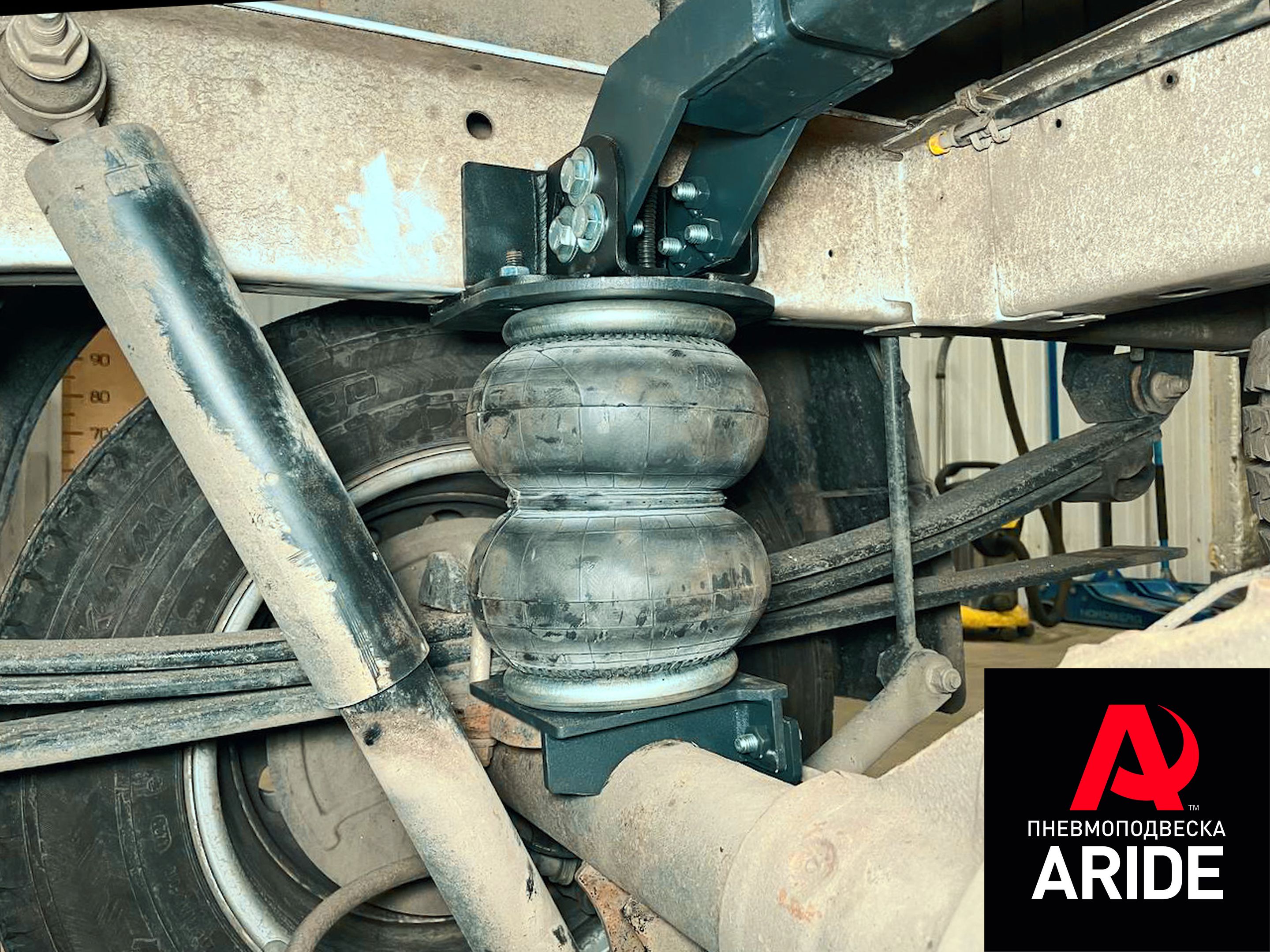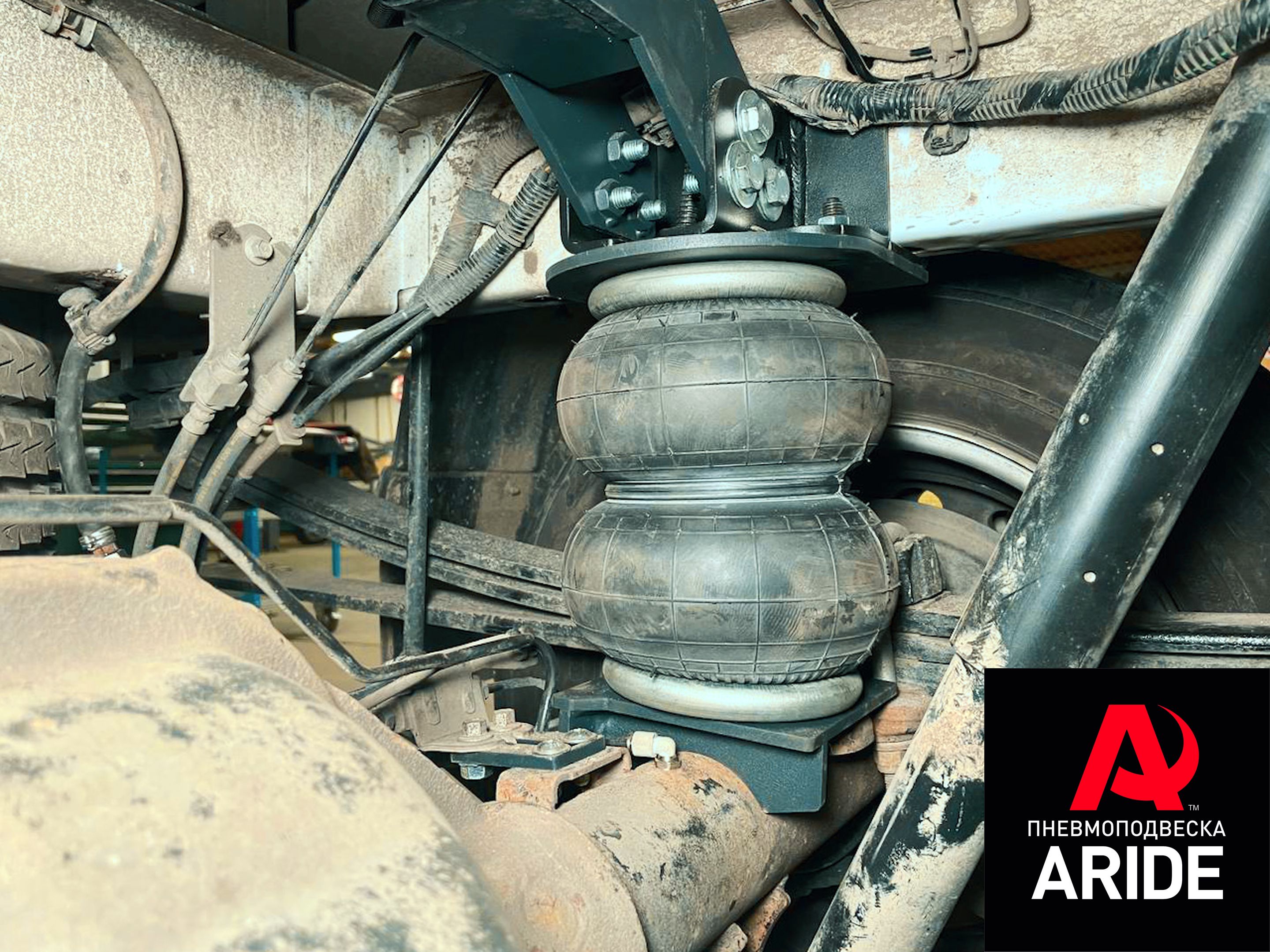На данный авто, нашими мастерами был установлен комплект пневмоподвески на заднюю ось, комплект снимает нагрузку до 3000кг с задней оси, что в свою очередь сильно облегчает работу рессорам. Комплект выполнен из 6мм стали, все соединения металла надёжно проварены. Комплект устанавливается между рамой и мостом автомобиля. Верхние кронштейны устанавливаются на раму и крепятся через резьбовые отверстия, куда раньше крепился заводской отбойник. Дополнительно верхние кронштейны соединяются между собой поперечным усилителем, для большей жёсткости конструкции. Нижние кронштейны устанавливаются на мост, и притягиваются через болтовое соединение к заводскому креплению стабилизатора.