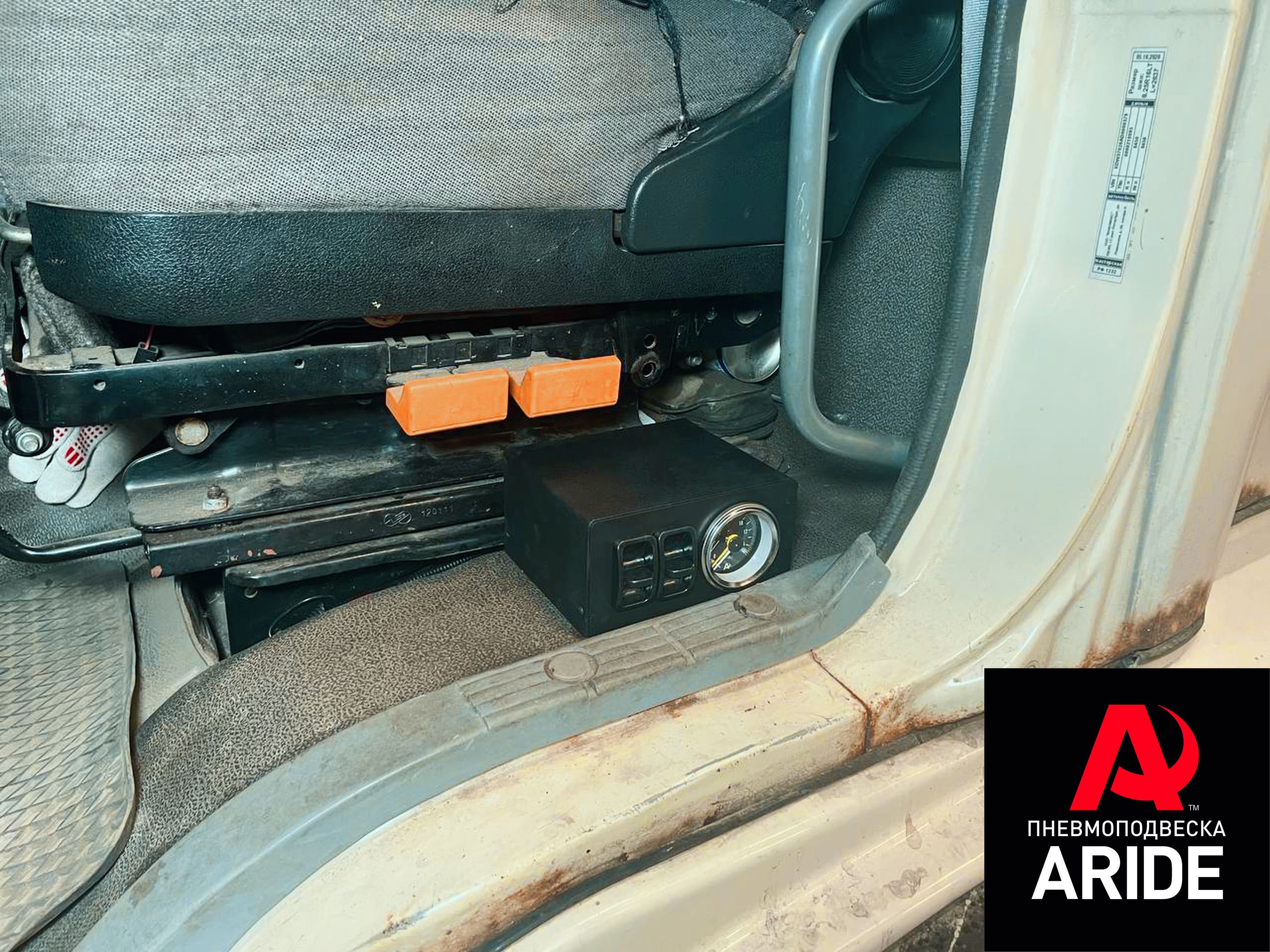 Для управления давлением в пневмоподушках на данном автомобиле используется двухконтурная система управления 2.ОБ.ПС. Это без компрессорная система управления, которая подключается к заводской воздушной системе. Для безопасного подключения к штатному ресиверу всегда используется шаровый кран. Блок управления данной системой состоит из двухстрелочного манометра с подсветкой и двух пневмоклавиш. Данный блок управления устанавливается слева от водительского сидения.
