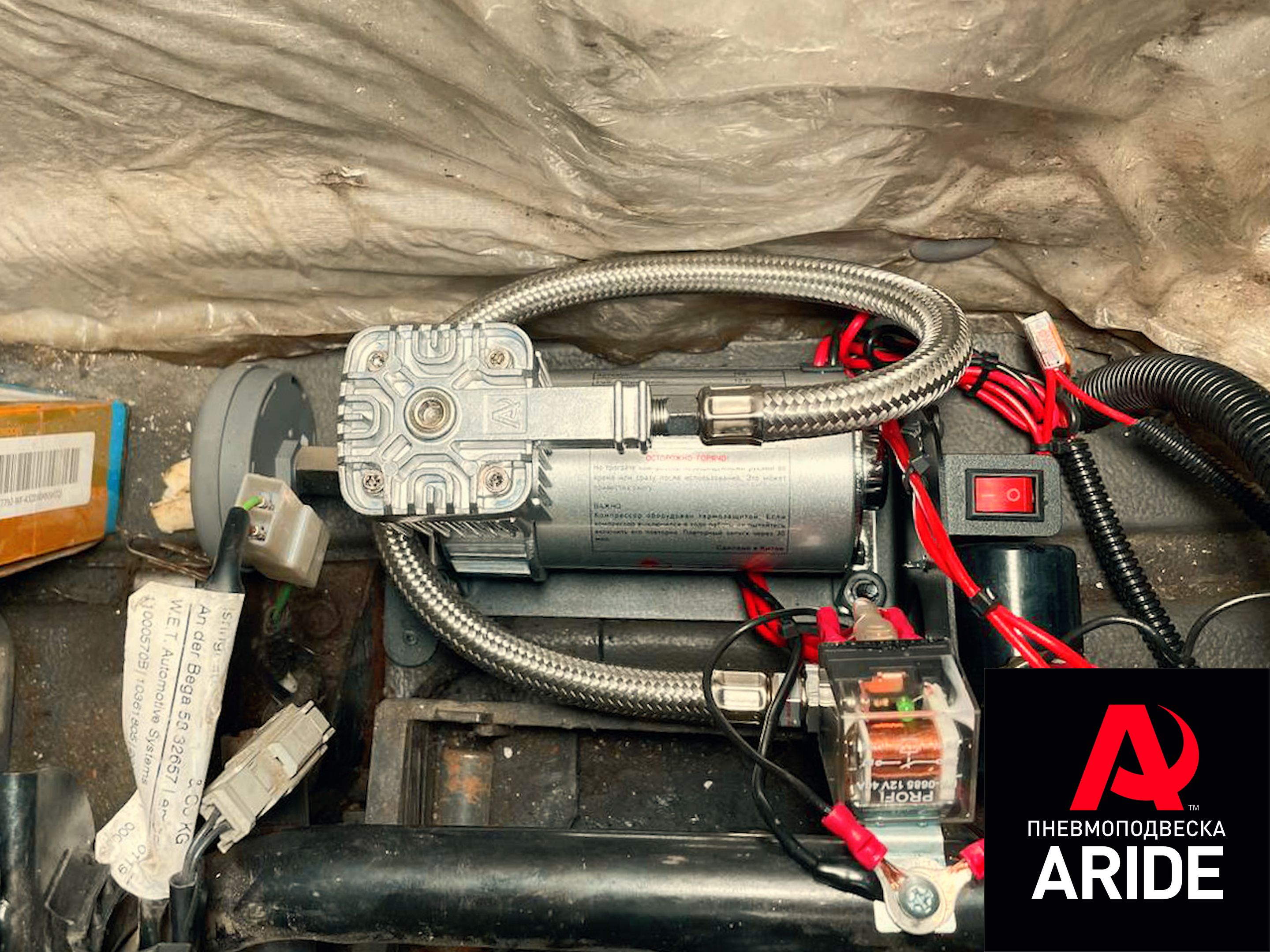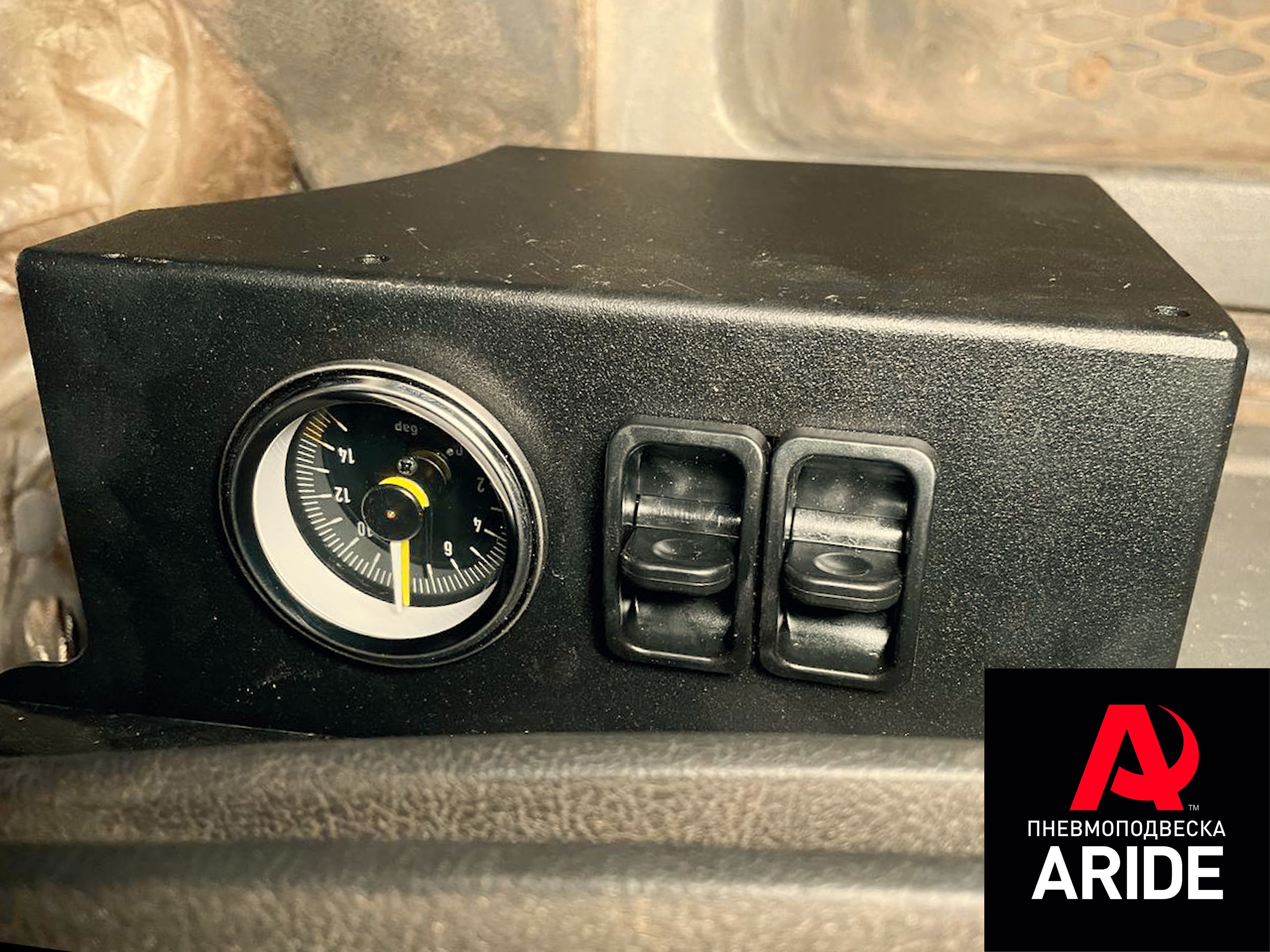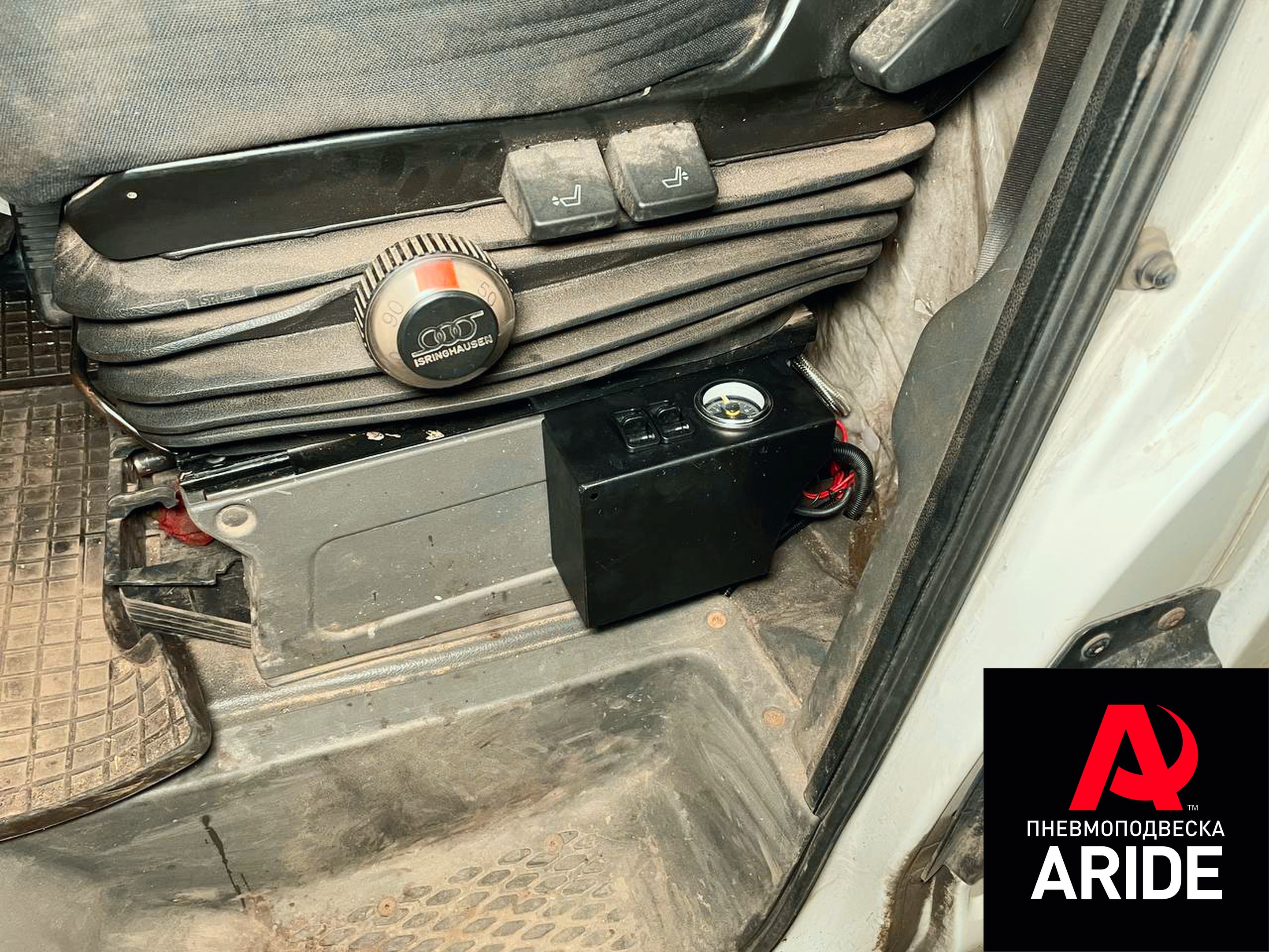 Управление пневмоподвеской реализовано за счёт двухконтурной системы управления 2.Оптимал. Данная система оборудована компрессором ARIDE 100, который способен накачать в пневмоэлементы давление до 8 атмосфер. Отслеживание и регулировка давления в подушках происходит за счёт двухстрелочного манометра и двух пневмоклавиш. Блок управления был установлен слева от водительского сидения, а сам компрессор расположился за водительским сидением.