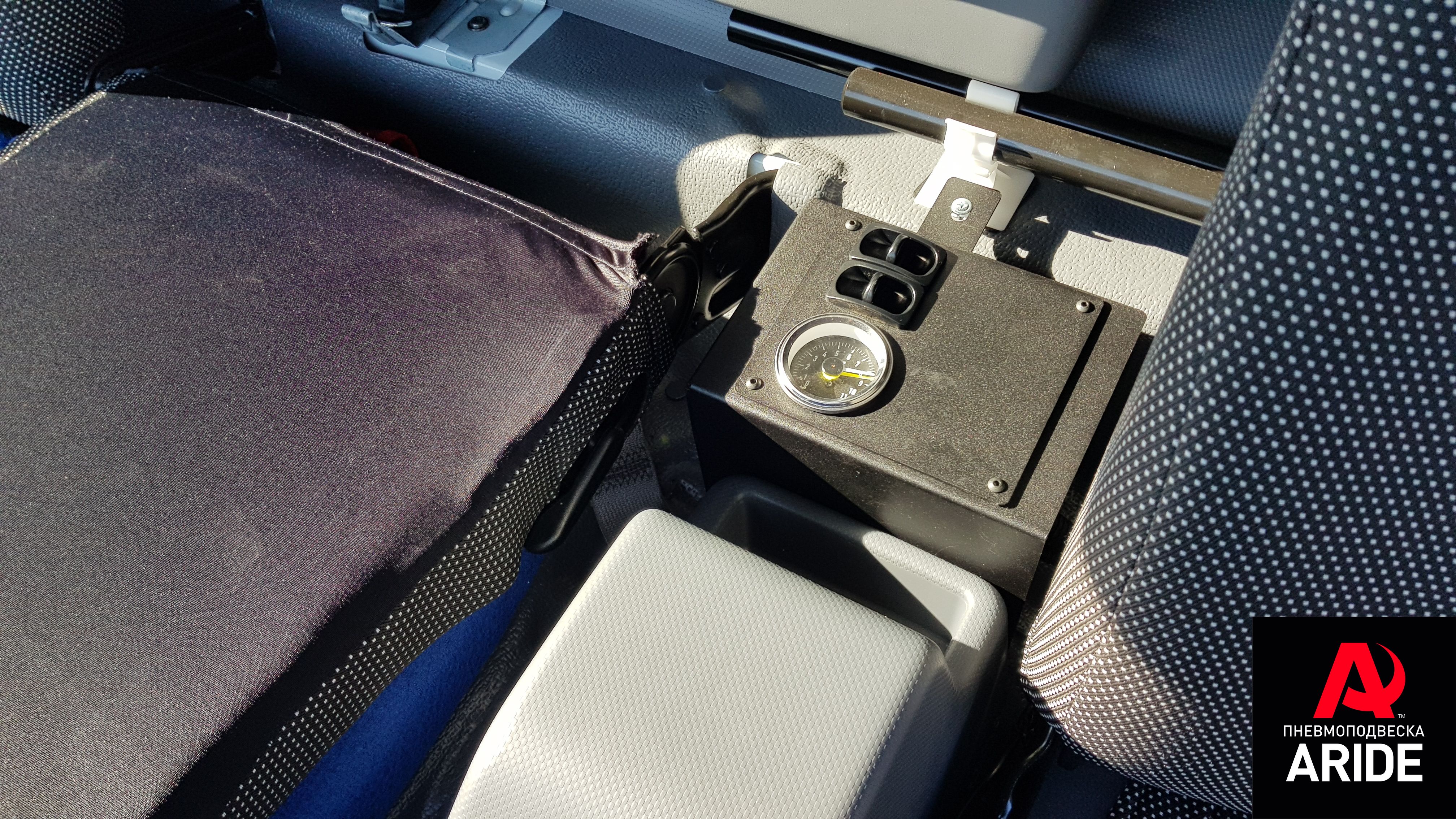 За управление пневмоподвеской отвечает двухконтурная система, подключенная к штатному ресиверу. По желанию заказчика была изготовлена и установлена панель для клавиш и манометра между сиденьями автомобиля.