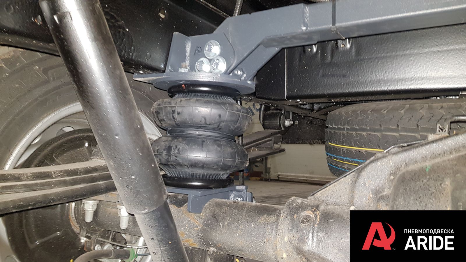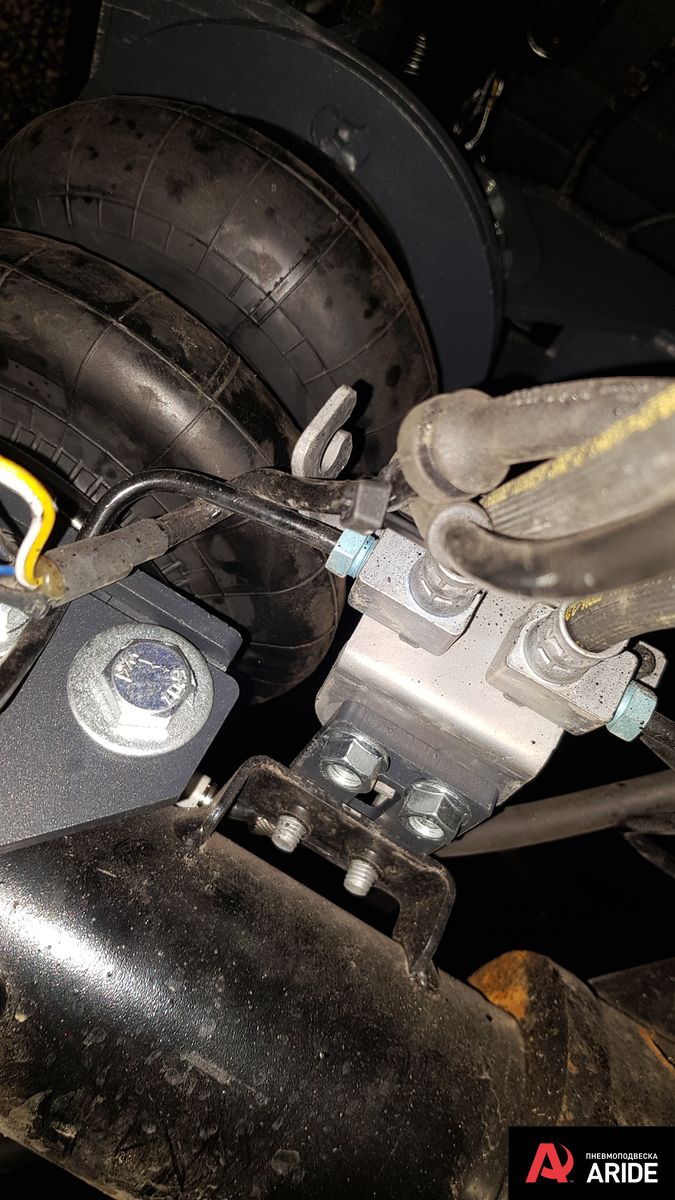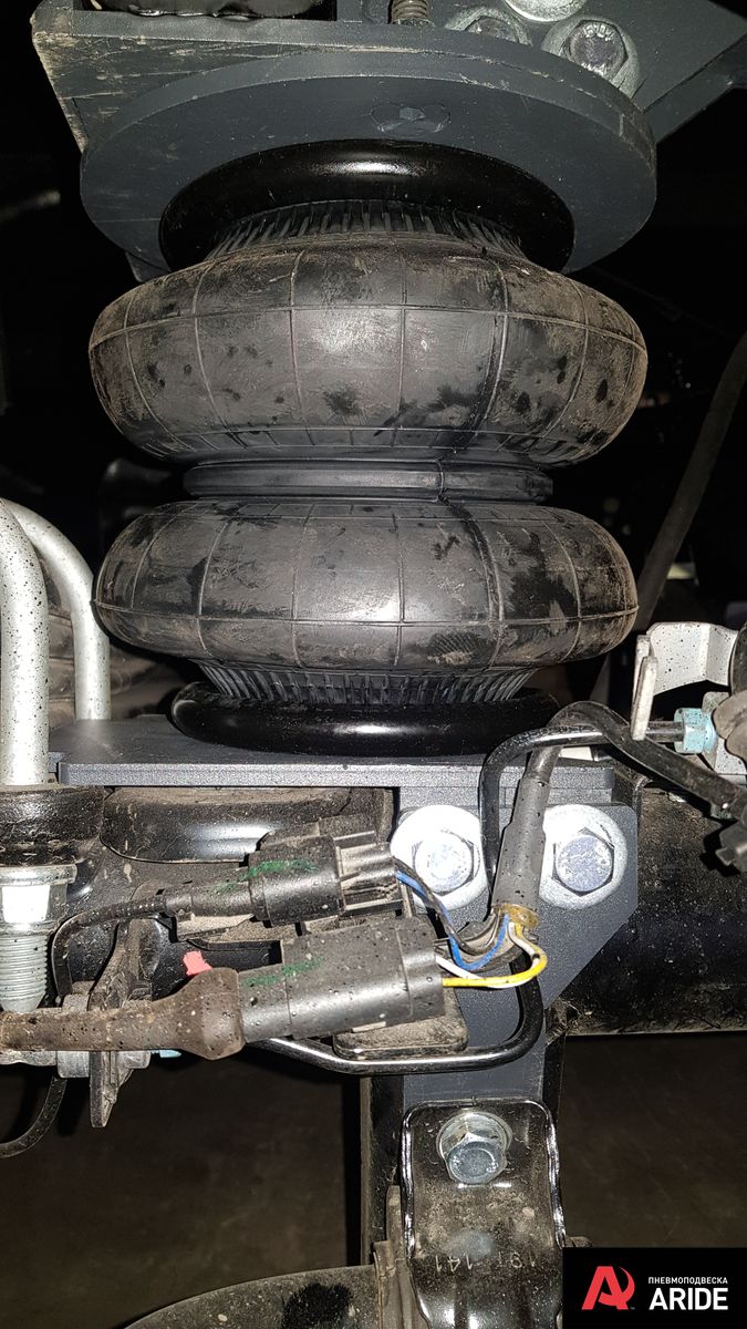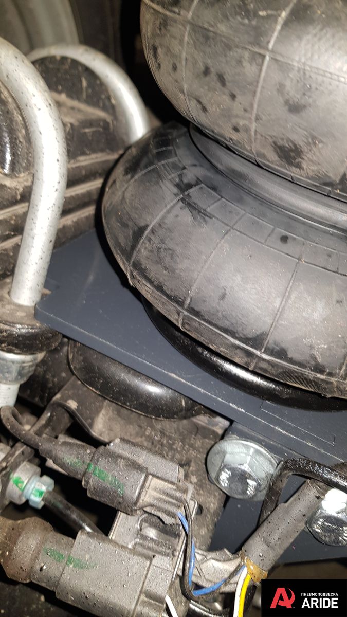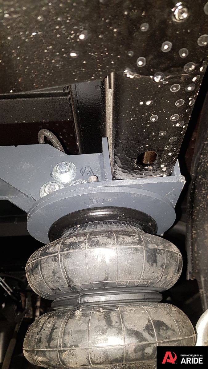 В дополнение к задним рессорам были установлены самые большие пневморессоры 180 мм диаметром с комплектом кронштейном разработанным именно под данную модификацию Форд Транзит с двускатной ошиновкой. Диаметр и грузоподъемность подушек и кронштейнов просчитана под данную шасси и обеспечивает необходимую грузоподъемность и при этом не ломает раму в отличие от комплектов сторонних производителей. Все элементы конструкции ставятся в штатные места и не требуют никаких доработок, а так же не наносят вред штатной проводке автомобиля идущей на мосту.