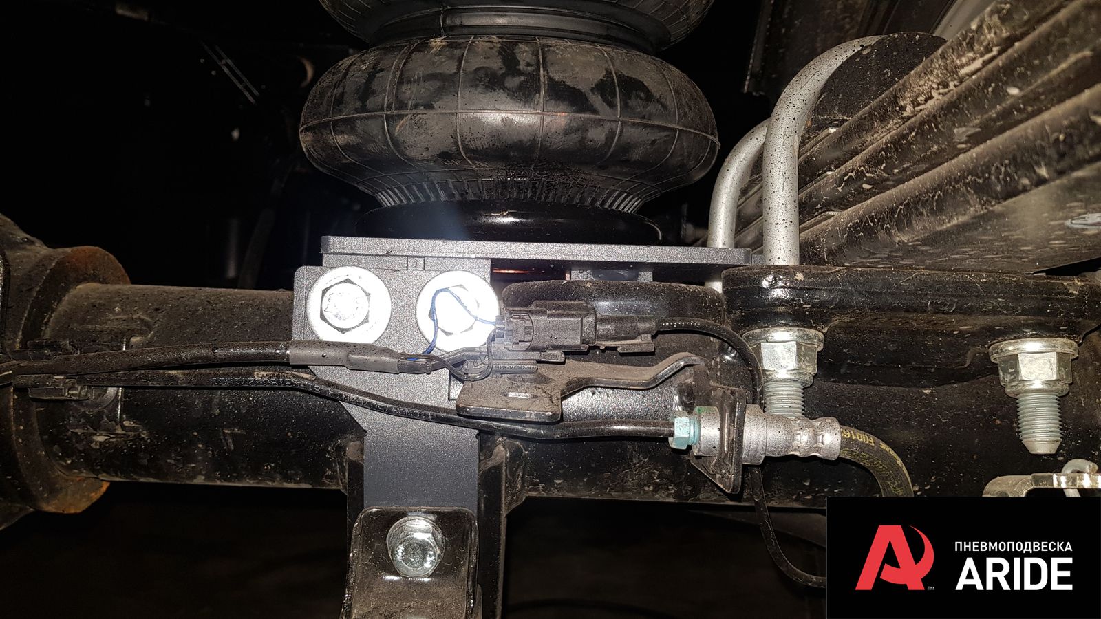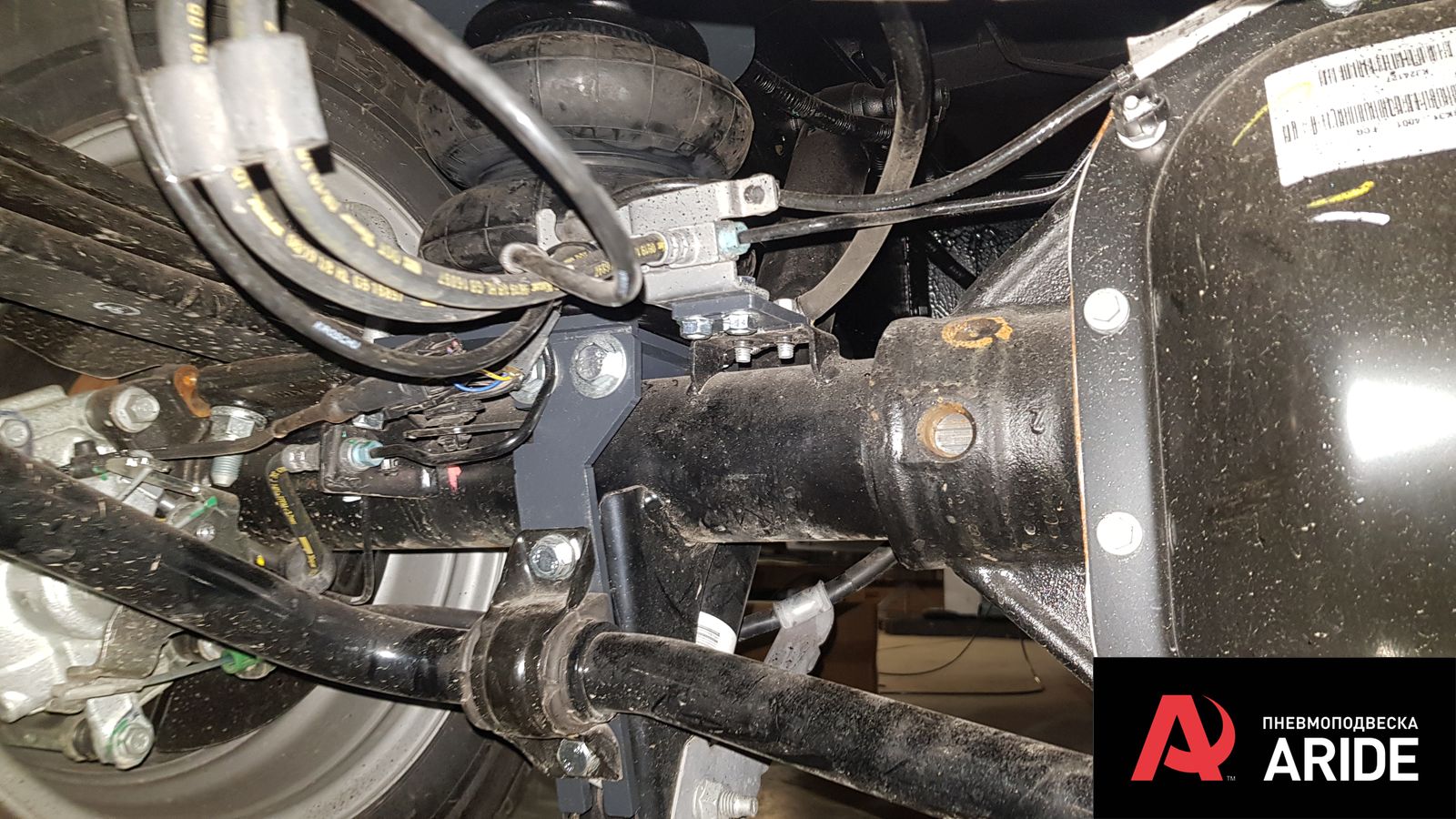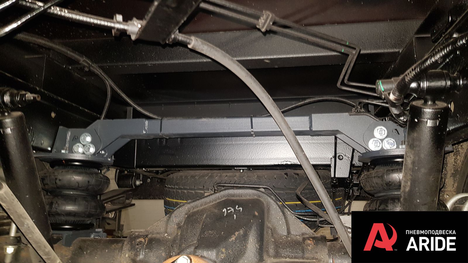 В дополнение к задним рессорам были установлены самые большие пневморессоры 180 мм диаметром с комплектом кронштейном разработанным именно под данную модификацию Форд Транзит с двускатной ошиновкой. Диаметр и грузоподъемность подушек и кронштейнов просчитана под данную шасси и обеспечивает необходимую грузоподъемность и при этом не ломает раму в отличие от комплектов сторонних производителей. Все элементы конструкции ставятся в штатные места и не требуют никаких доработок, а так же не наносят вред штатной проводке автомобиля идущей на мосту.