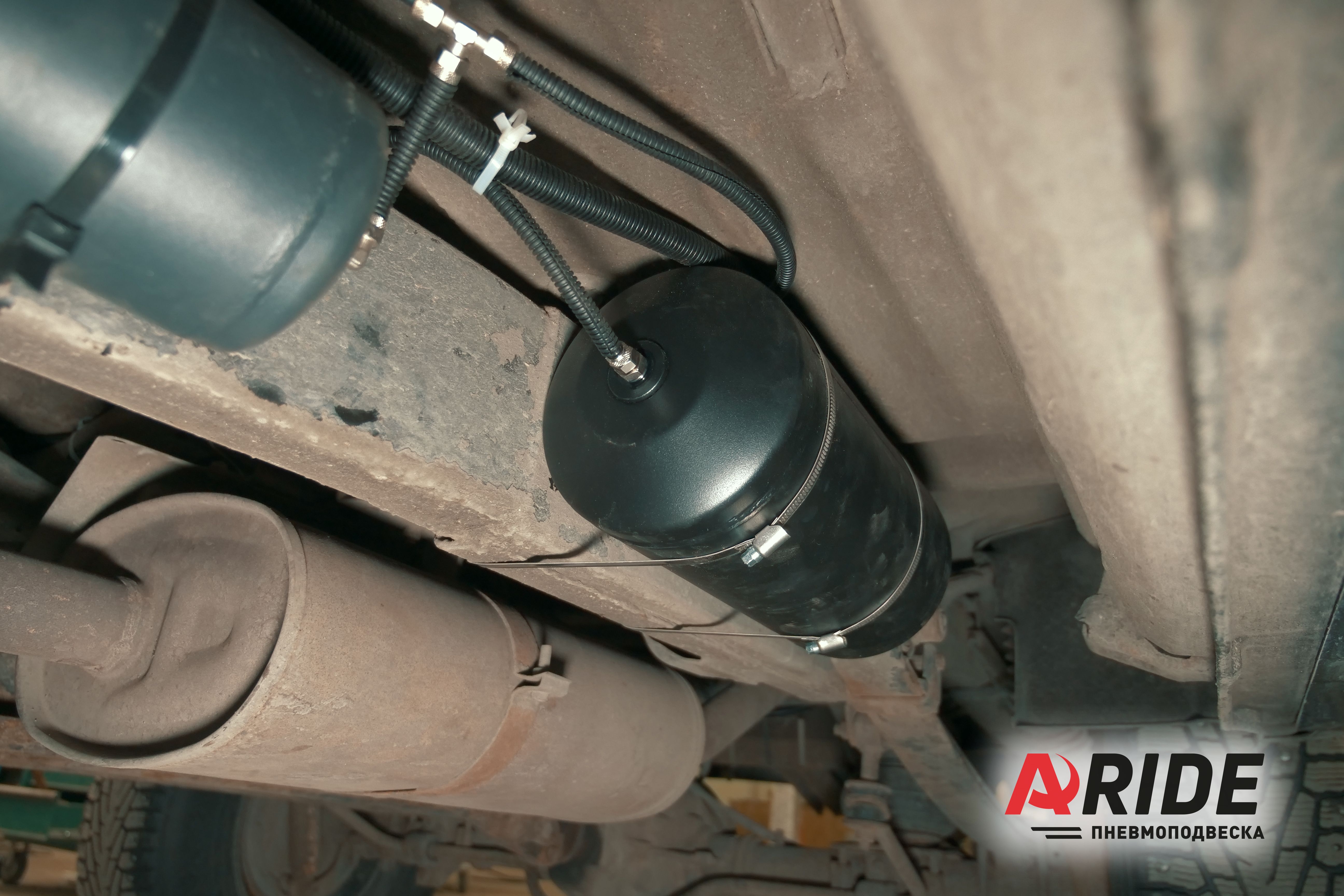 Комплект вспомогательной пневмоподвески на задней оси уже был установлен клиентом ранее. Комплект устанавливается между мостом и рамой. Верхние кронштейны крепятся к раме, а нижние кронштейны устанавливаются на мост и притягиваются обхватами.