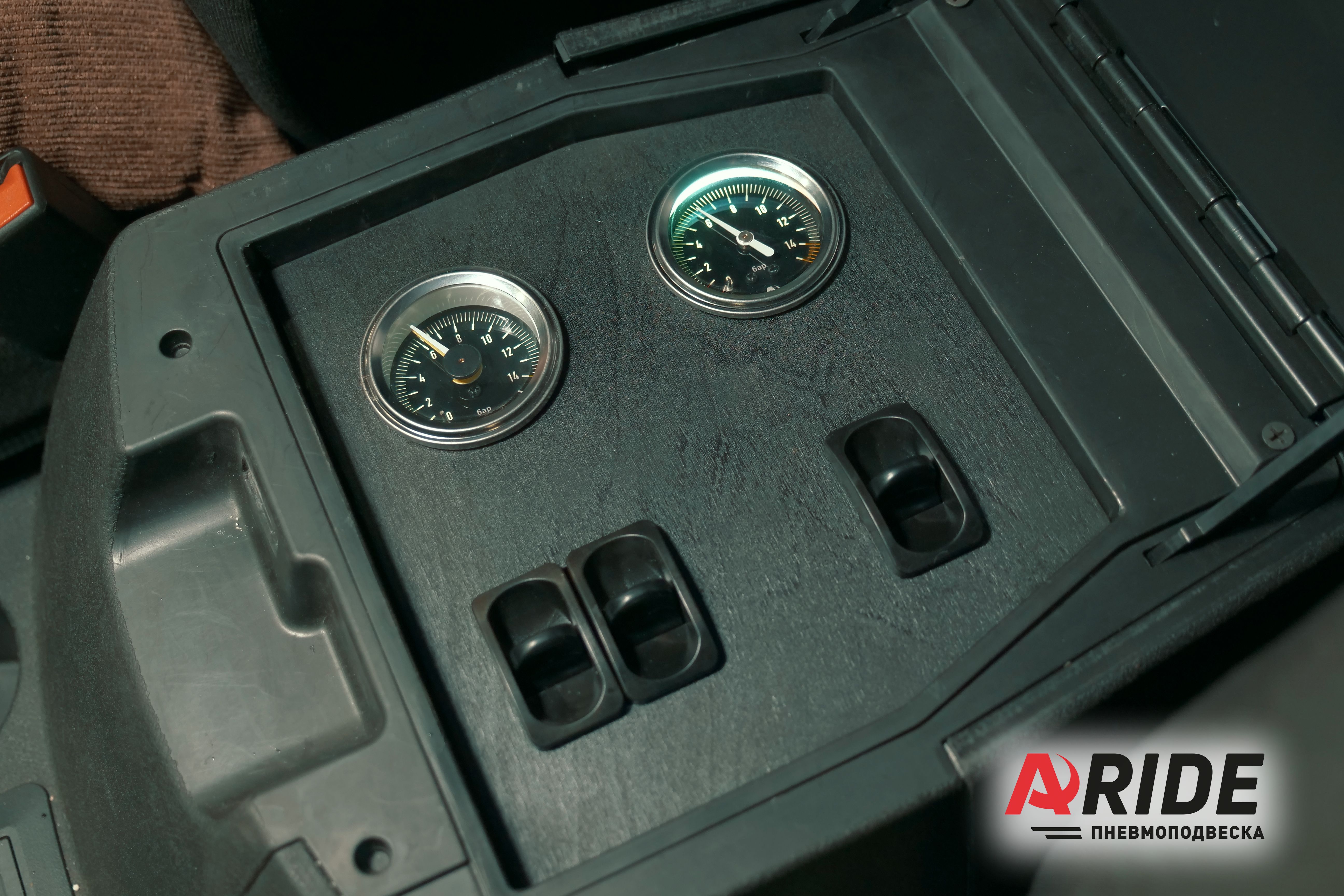 Регулировка давления в подушках обеспечивается за счёт трёхконтурной системы управления 3.120.ПС. Компрессор ARIDE 100C , был установлен в подкапотном пространстве, рядом с климатической установкой. Ресивер, входящий в систему управления был закреплён на раме, рядом с ресиверами, которые напрямую подключаются к подушкам. Два манометра и пневмоклавиши были установлены в подлокотник, при помощи специальной пластины.