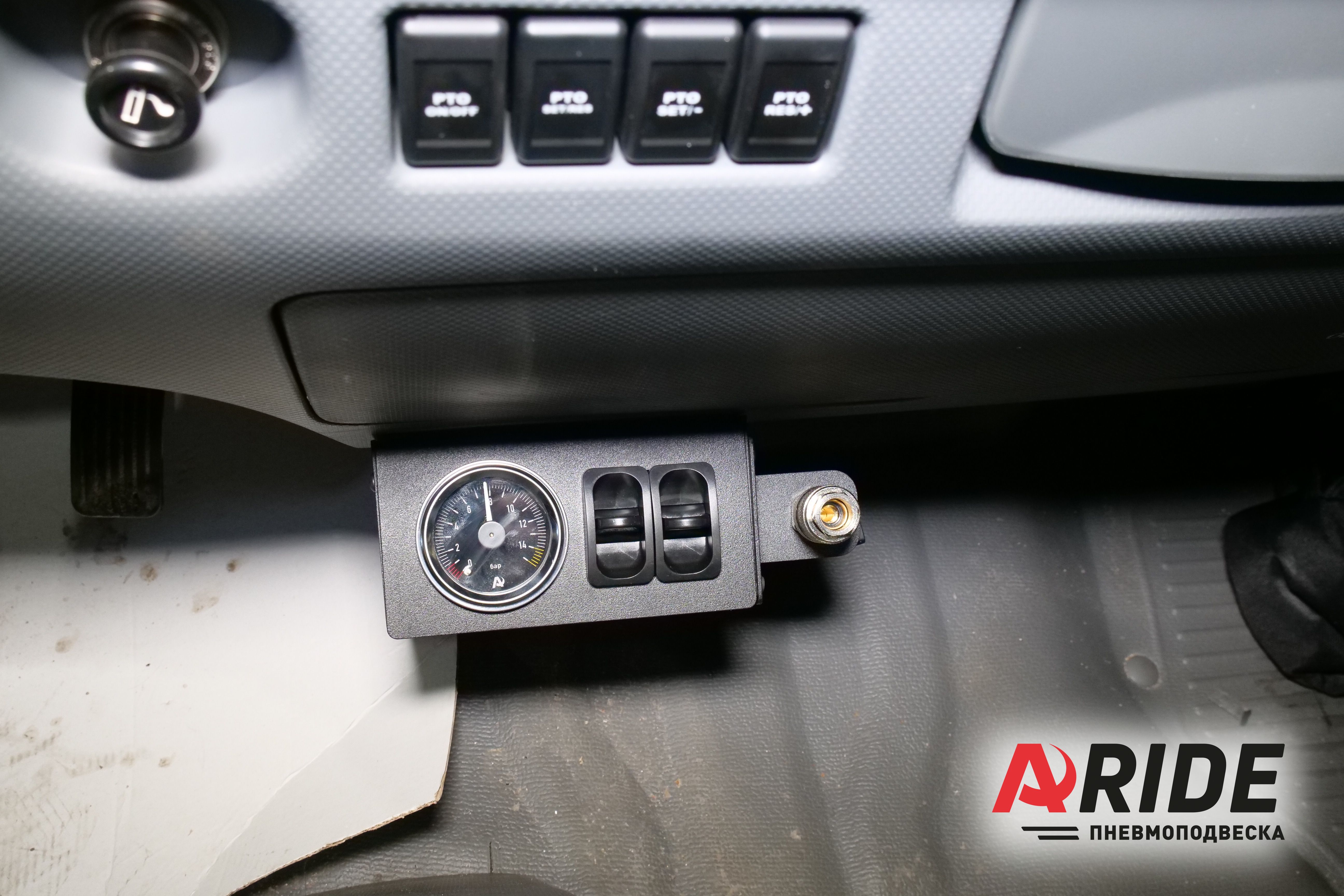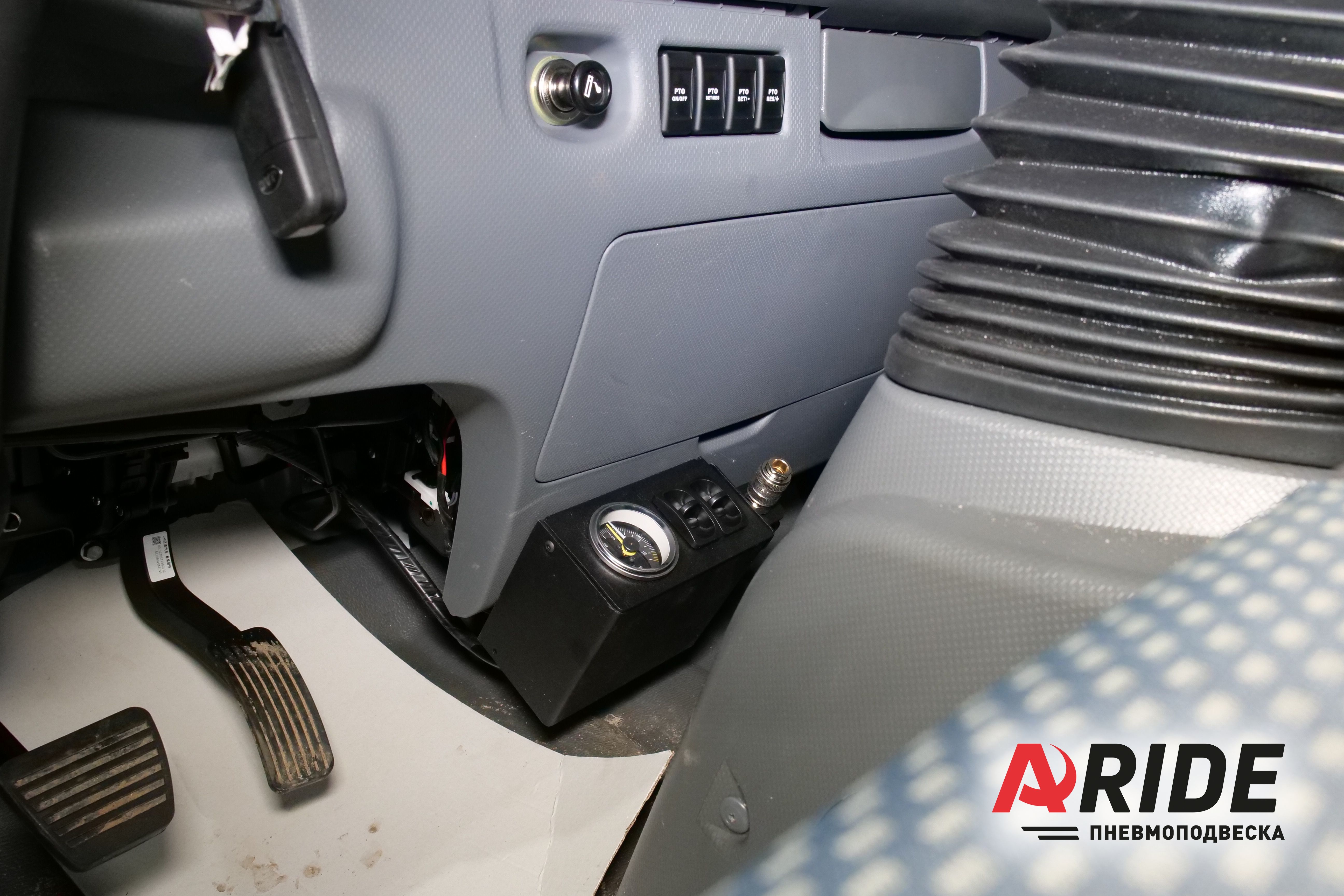 Регулировка давления обеспечивается за счёт двухконтурной системы 2.об.пс, которая подключается к заводскому воздушному ресиверу. Так же автомобиль был оборудован системой подкачки/продувки. Быстросъём был установлен справа от блока управления пневмоподвеской.