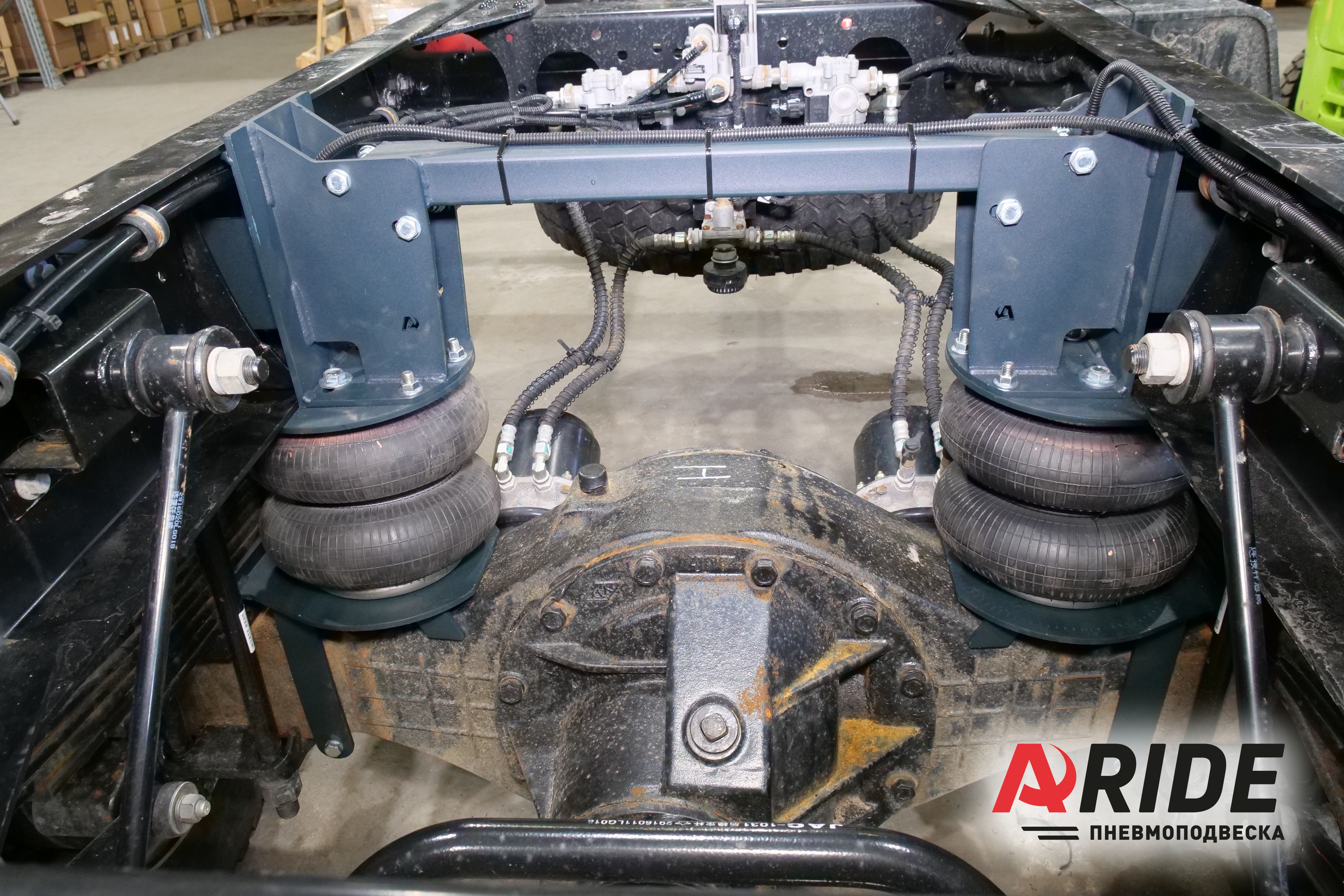 В данном проекте интересно то, что автомобиль приехал к нам ещё без фургона, просто "голое" шасси. Это позволяет не только более удобно установить комплект, а так же намного быстрее, ведь доступ к мосту и раме ничем не ограничен. Как это принято, комплект на заднюю ось устанавливается между мостом и рамой. Крепление осуществляется через заводские отверстия в раме, а так же за счёт обхватов моста. Для уменьшения вращающего момента, комплект включает в себя поперечный усилитель. В данном проекте используются пневматические подушки 250/2, грузоподъёмность каждой составляет 2000 килограмм при давлении в 8 атмосфер.
